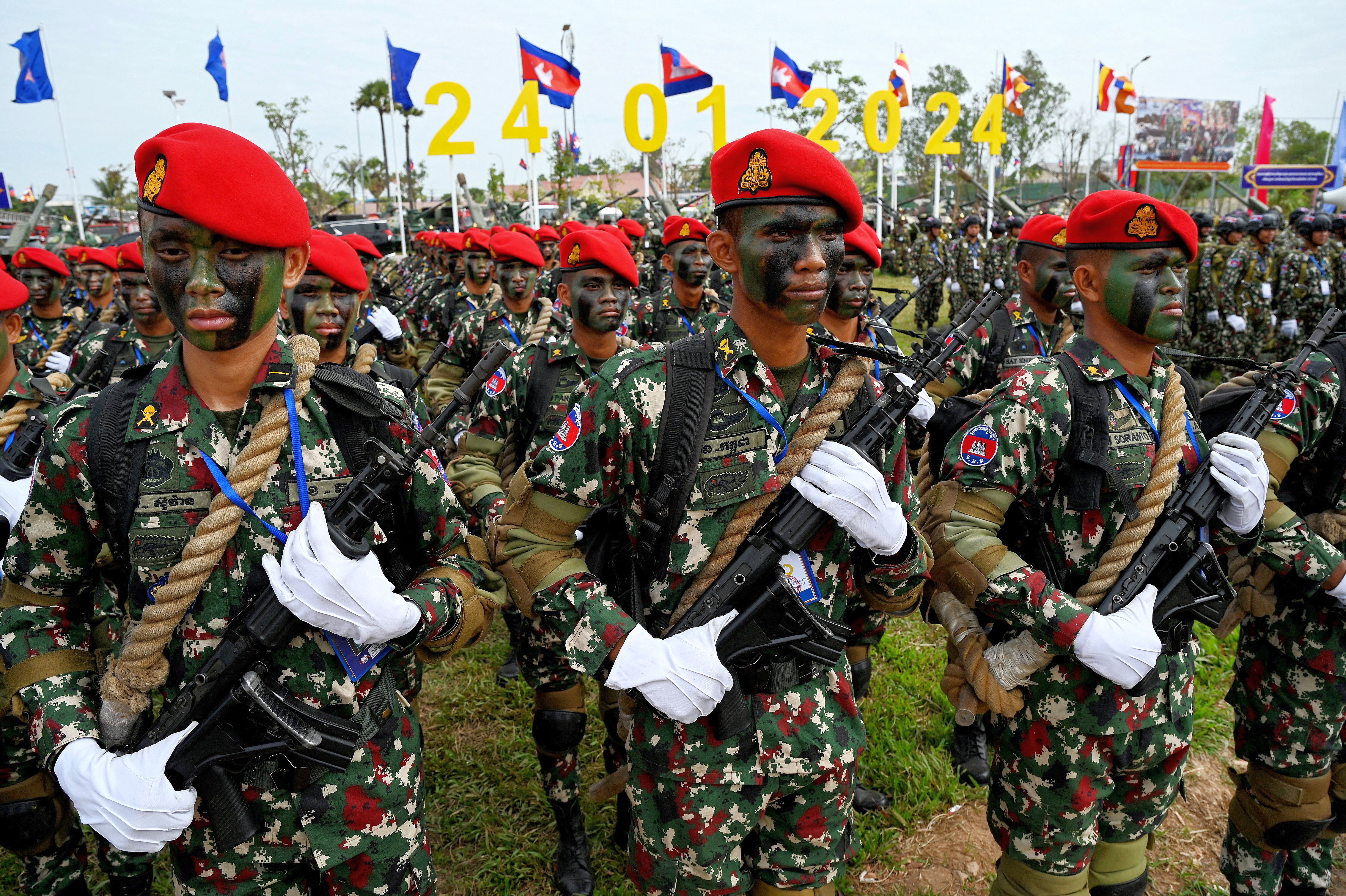 A commando unit stand in formation during a ceremony marking the 25th anniversary of the formation of the Royal Cambodian Army in Phnom Penh on January 24, 2024. (Photo by Tang Chhin Sothy/AFP Photo)