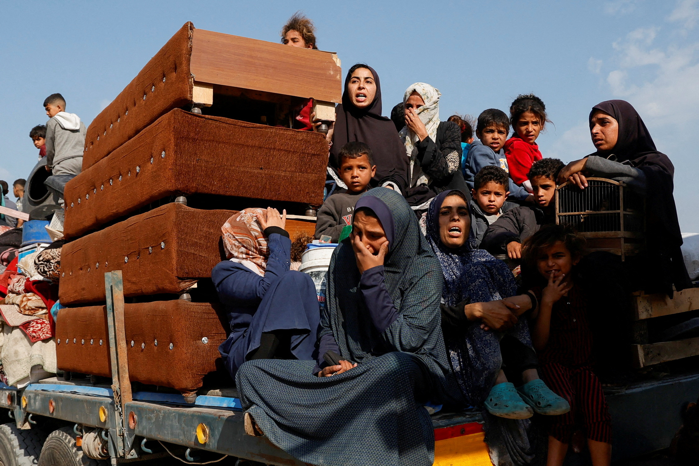 Palestinians ride on a truck as they flee their homes, after the Israeli army issued evacuation orders for a number of neighborhoods, following heavy Israeli strikes, in Rafah in the southern Gaza Strip on March 18, 2025. (Photo by Hatem Khaled/Reuters)