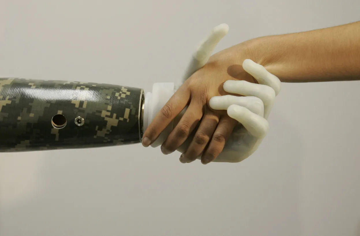Iraq war veteran Sgt. Juan Arredondo, one of the first recipients of a bionic hand with independently moving fingers called the i-Limb, shakes a reporters hand during an interview on July 23, 2007 in New York. Arredondo's bionic hand has finger “joints” that flex and bend like natural fingers. (Photo by Mary Altaffer/AP Photo via The Atlantic)