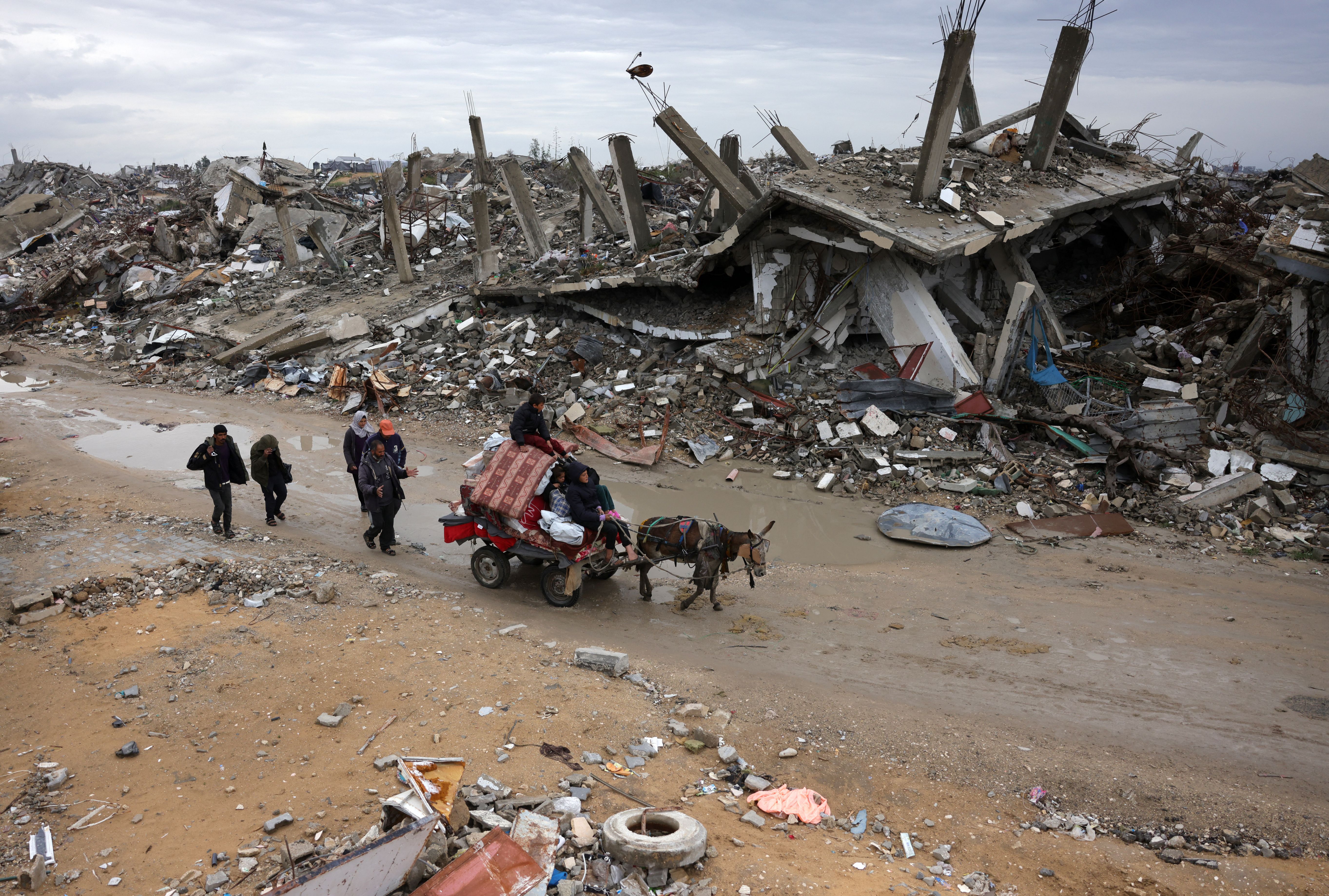 Palestinians use a donkey-pulled cart to transport their belongings as they flee Beit Lahia in the Northern Gaza Strip on March 21, 2025. Gaza's civil defence agency said on March 20 that 504 people had been killed since the bombardment resumed, more than 190 of them minors. (Photo by Bashar Taleb/AFP Photo)