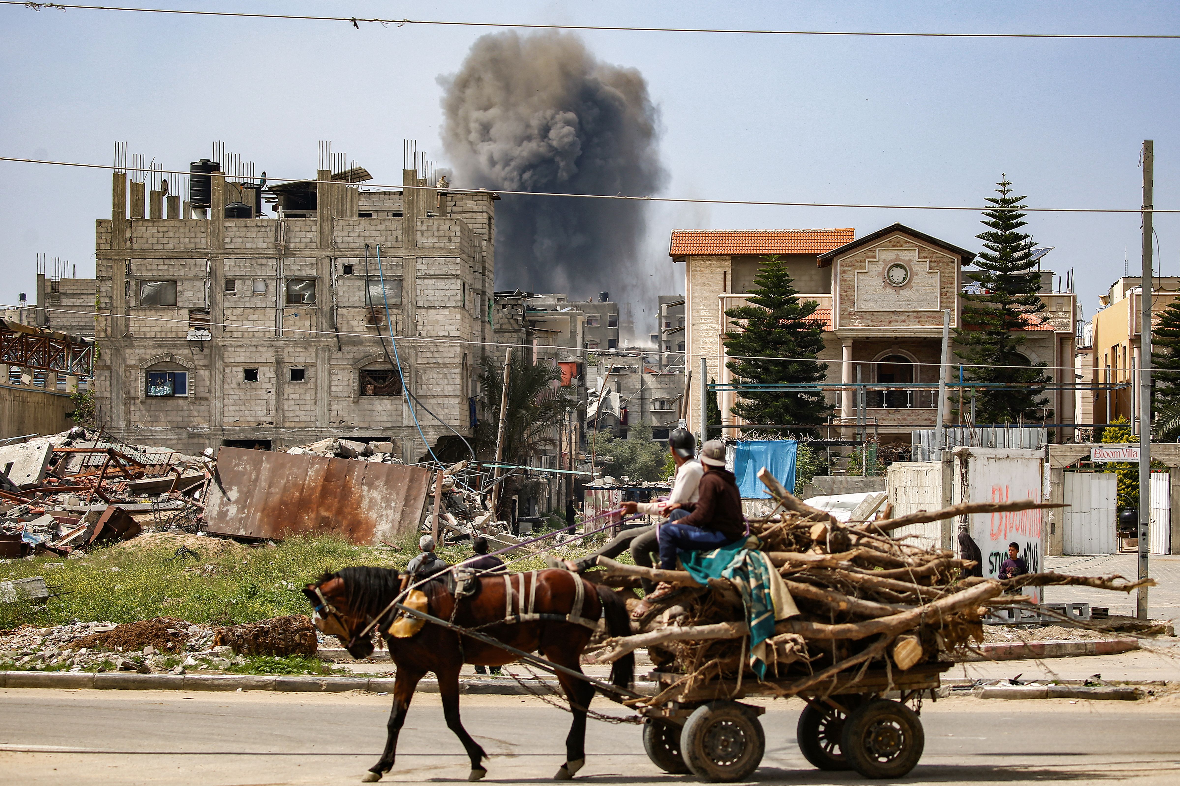 Men riding a horse-drawn cart carrying chopped tree branches for lumber watch as a smoke plume erupts from a building that was hit by Israeli bombardment after prior warning in the Nuseirat camp for Palestinian refugees in the central Gaza Strip on March 25, 2025. Israel, vowing to destroy Palestinian militant group Hamas, on March 18 resumed intense bombardment of Gaza and redeployed ground troops, shattering a truce that had largely held since January 19. (Photo by Eyad Baba/AFP Photo)