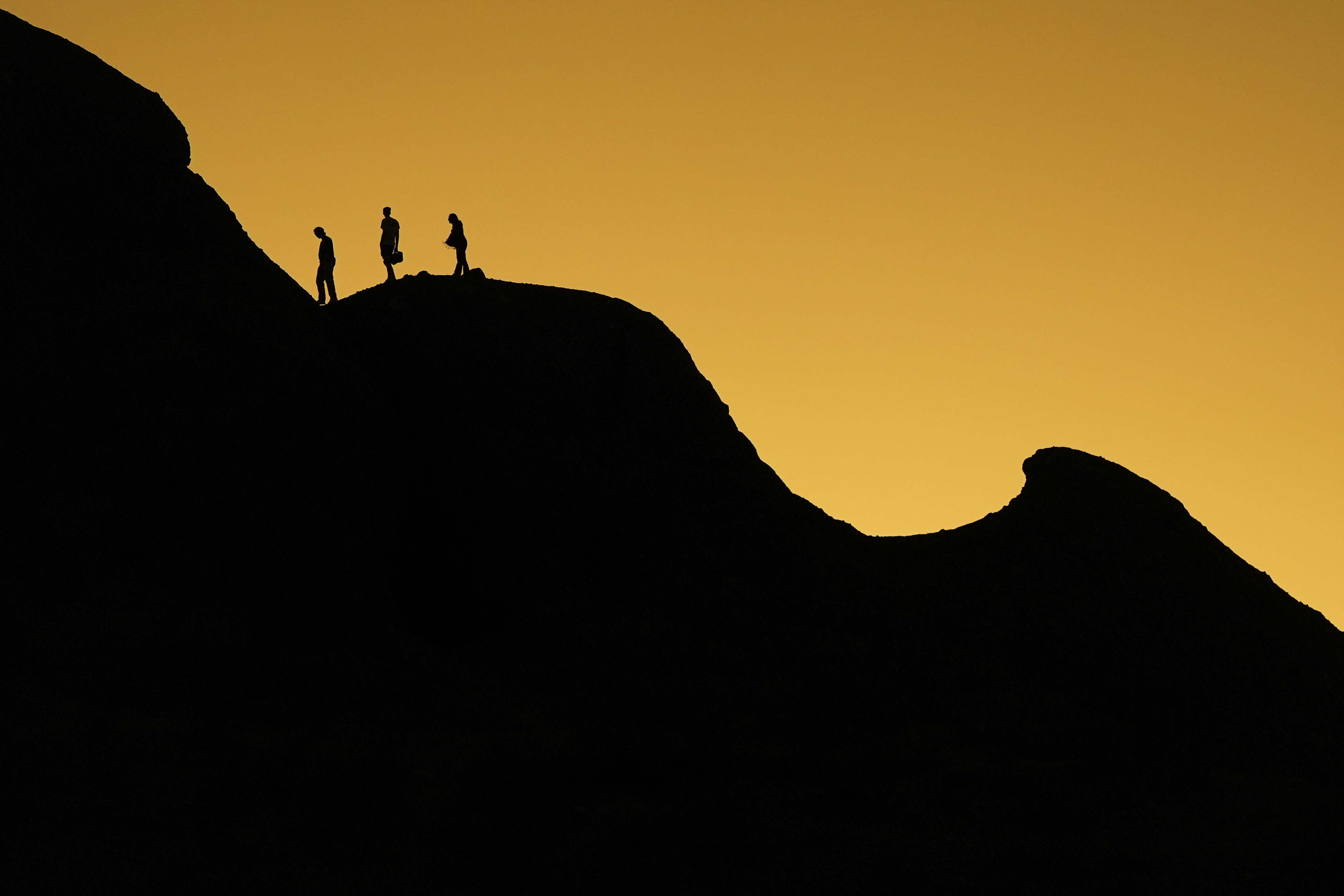 People walk on top of the Hole in the Rock formation as the sun sets at Papago Park, Tuesday, February 25, 2025, in Phoenix. (Photo by Lindsey Wasson/AP Photo)