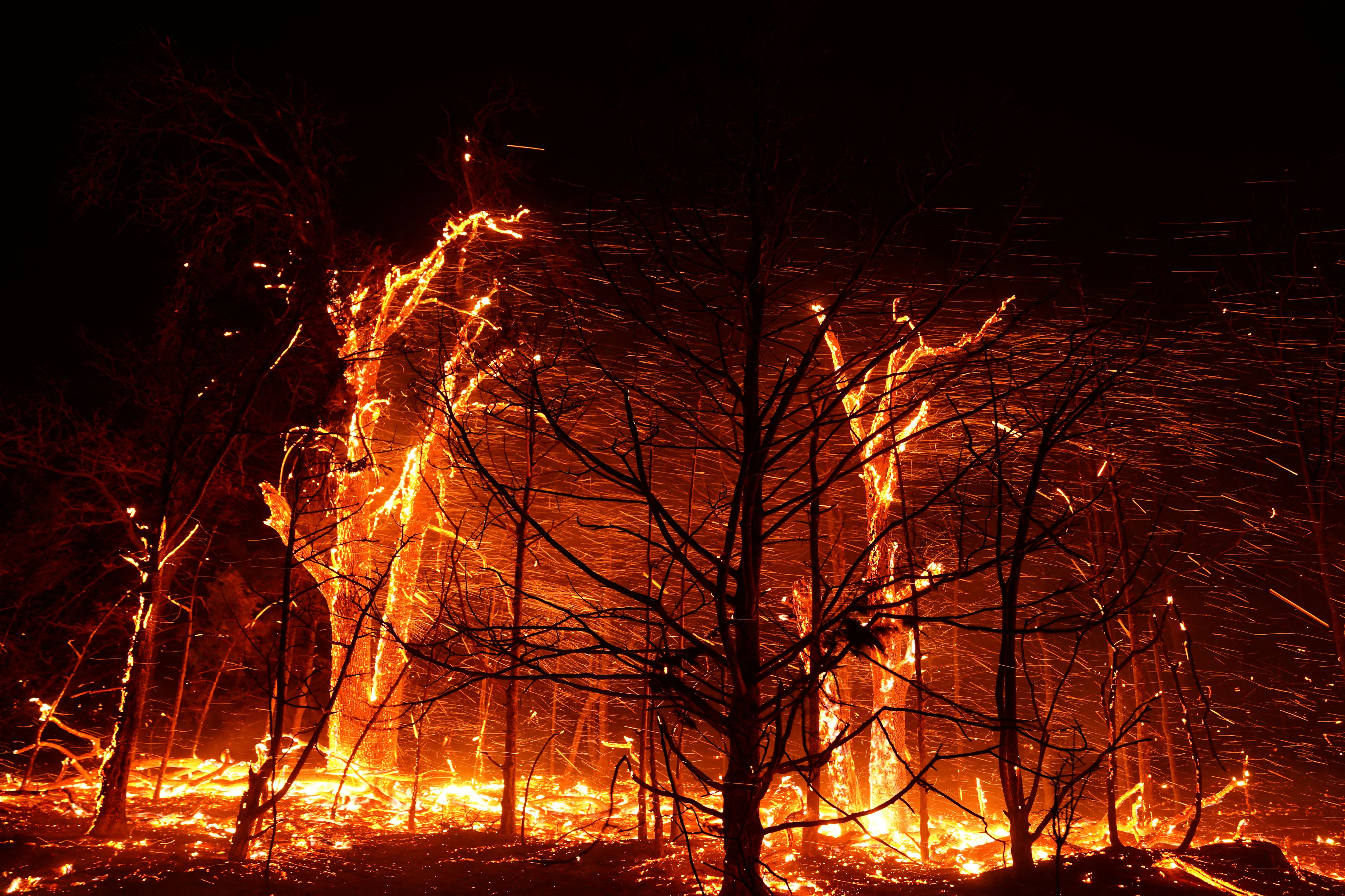 Fire burns trees during a wildfire outbreak in Stillwater, Oklahoma, on March 14, 2025. (Photo by Nick Oxford/Reuters)