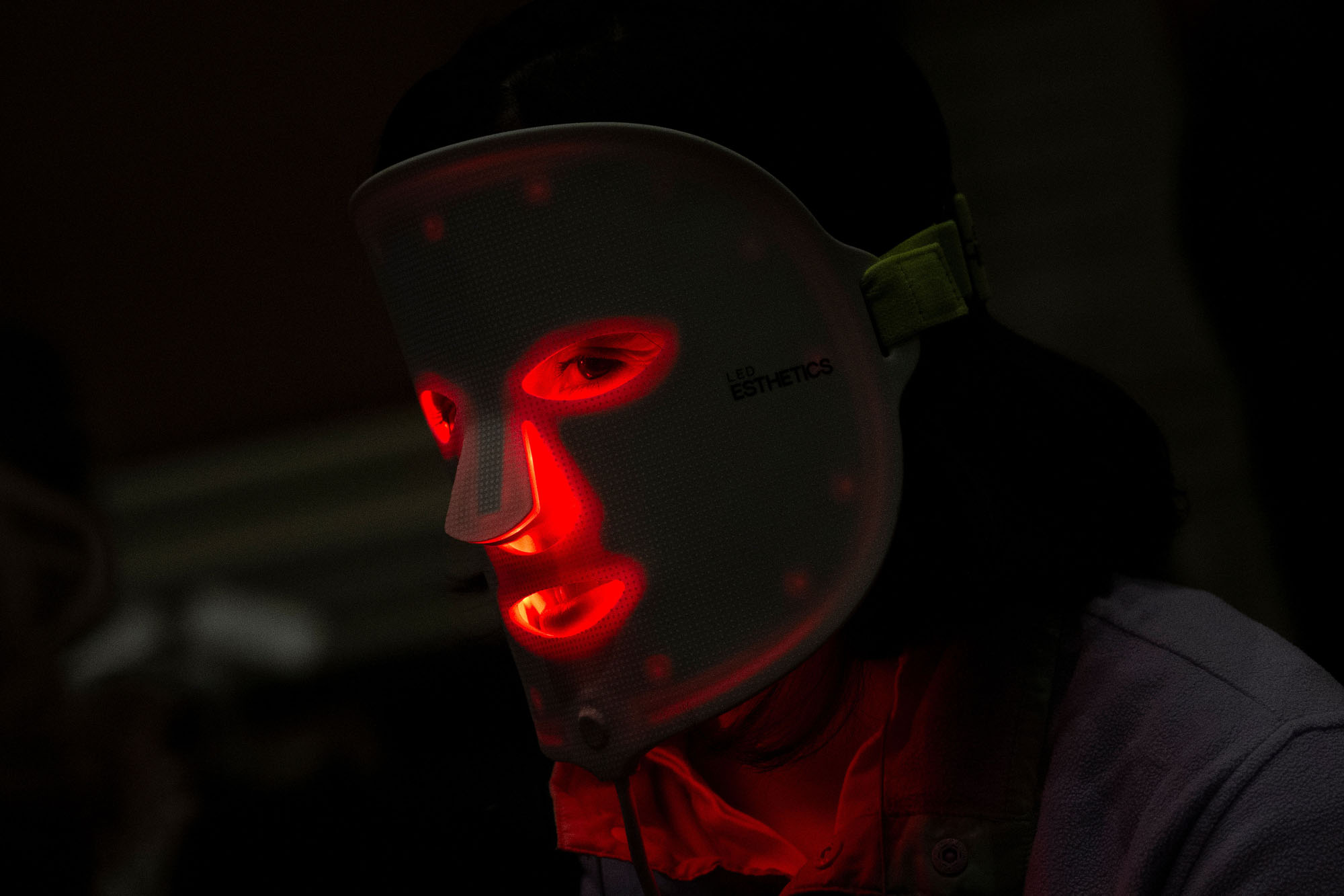 A person wears a red light mask from Light Tree Ventures during Pepcom's Digital Experience at the The Mirage resort during the Consumer Electronics Show (CES) in Las Vegas, Nevada on January 8, 2024. (Photo by Brendan Smialowski/AFP Photo)