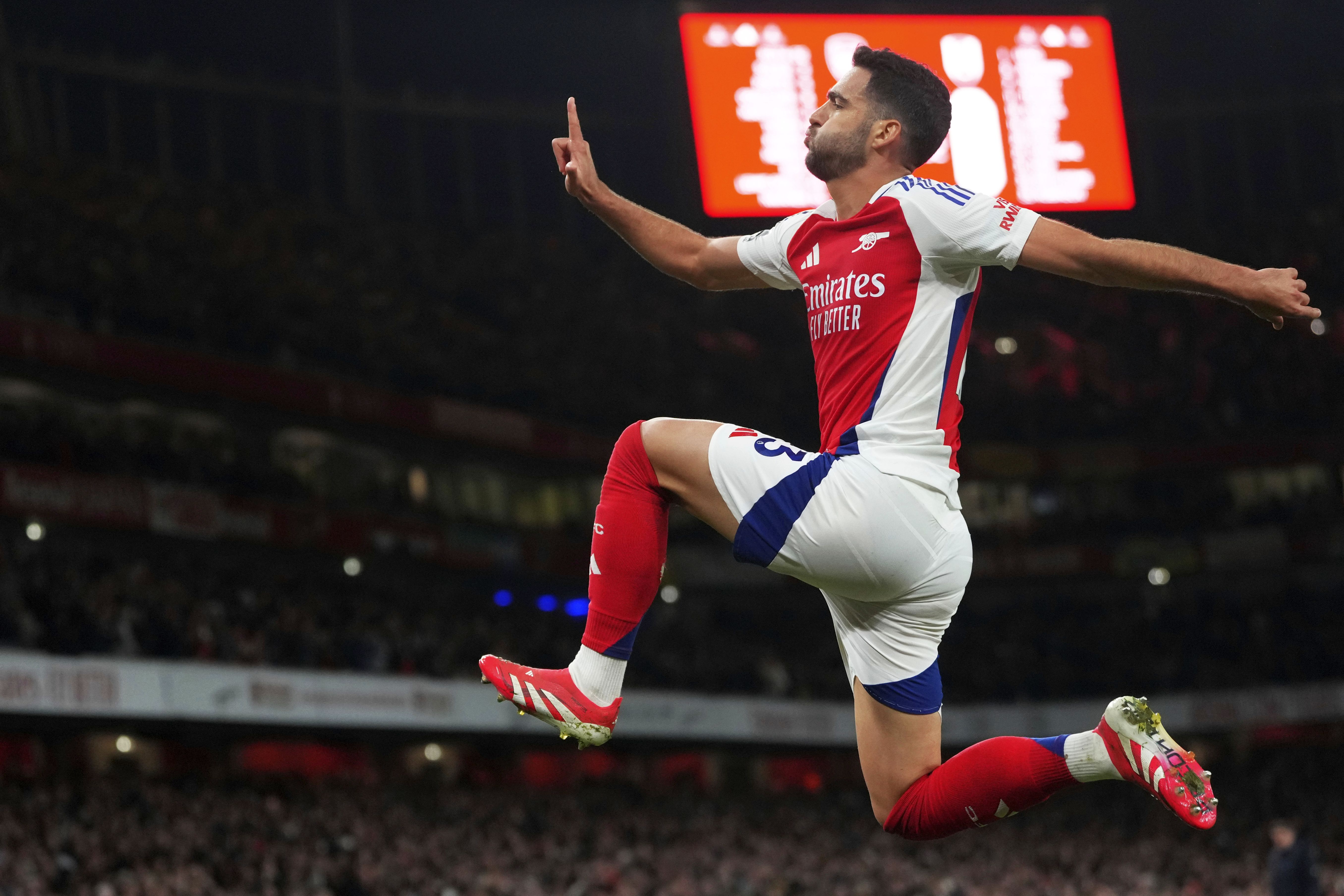 Arsenal's Mikel Merino celebrates after scoring the opening goal during the English Premier League soccer match between Arsenal and Fulham at Emirates stadium in London, Tuesday, April 1, 2025. (Photo by Kirsty Wigglesworth/AP Photo)