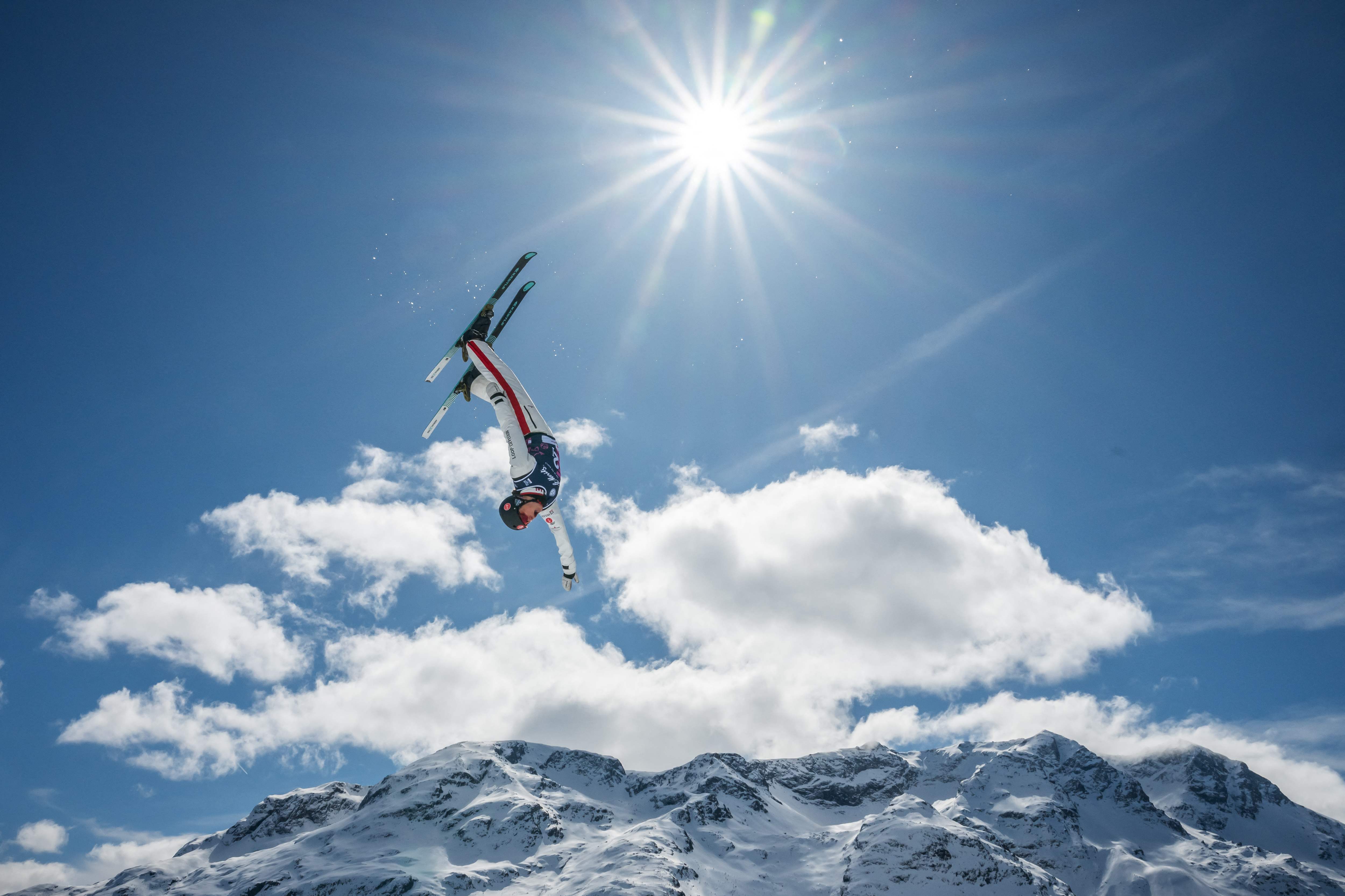 Canada's Marion Thenault warms up prior to the Mixed Team Aerials final event at the FIS Snowboard, Freestyle and Freeski World Championships 2025 in St Moritz, on March 27, 2025. (Photo by Fabrice Coffrini/AFP Photo)