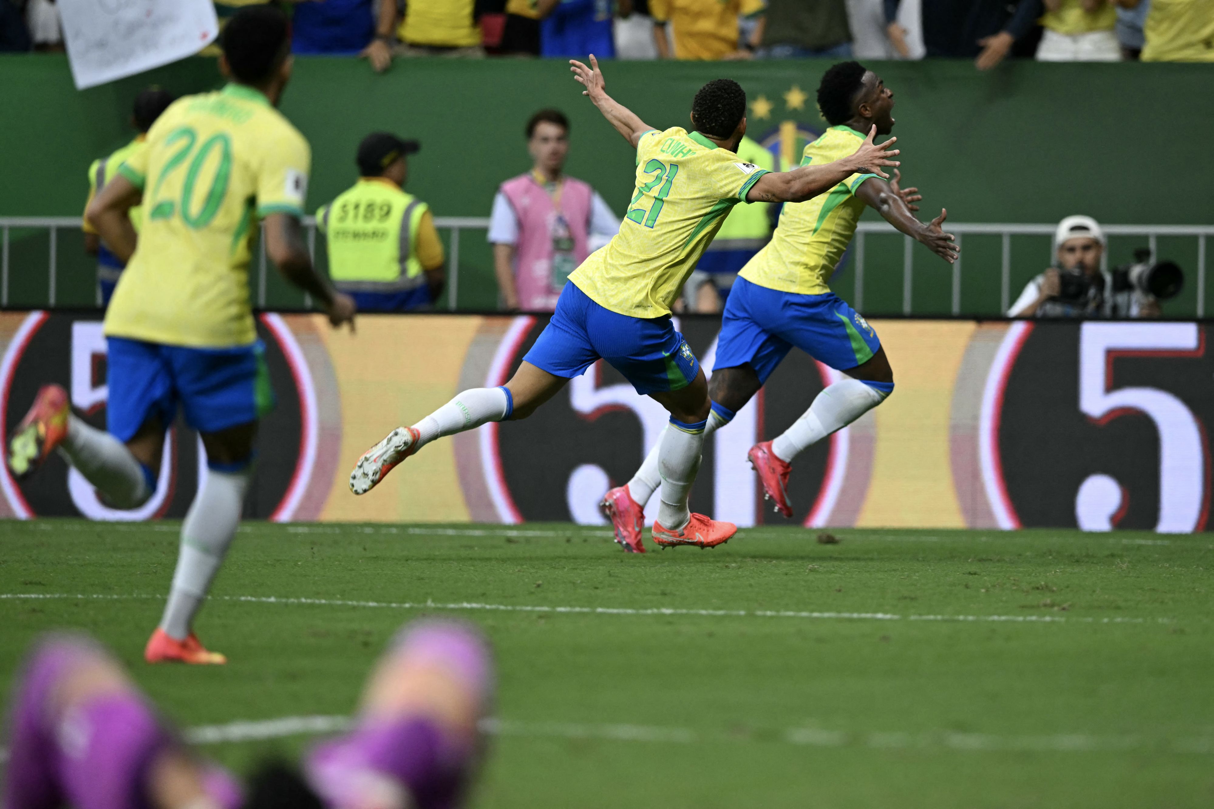 Brazil's forward #07 Vinicius Jr (R) celebrates after scoring during the 2026 FIFA World Cup South American qualifiers football match between Brazil and Colombia, at the Mane Garrincha stadium in Brasilia, on March 20, 2025. (Photo by Evaristo Sa/AFP Photo)