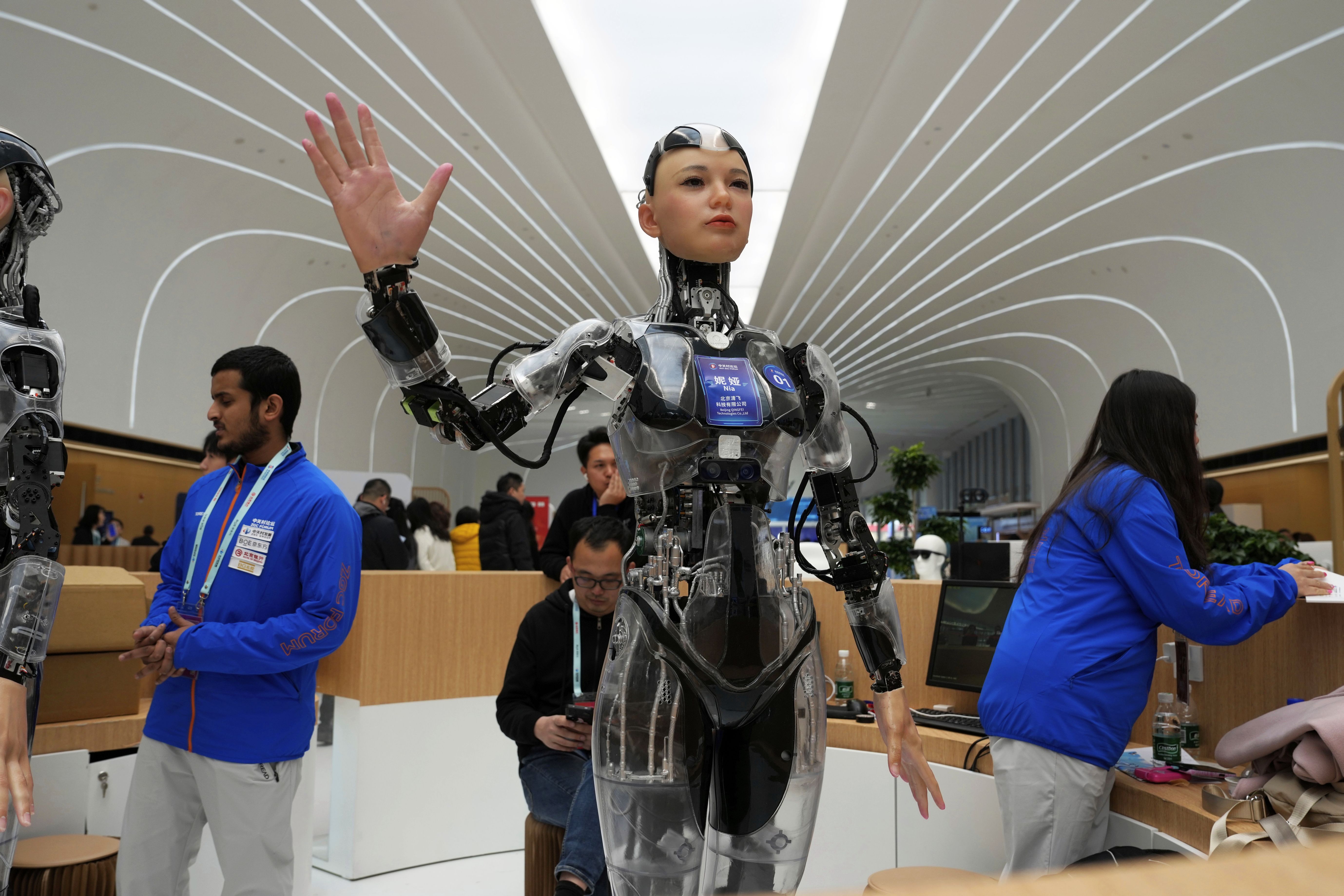 A robot named Nia from Beijing Qingfei Technologies Co. Ltd greets visitors to the Zhongguancun Forum at the Zhongguancun International Innovation Center in Beijing, China, Friday, March 28, 2025. (Photo by Ng Han Guan/AP Photo)