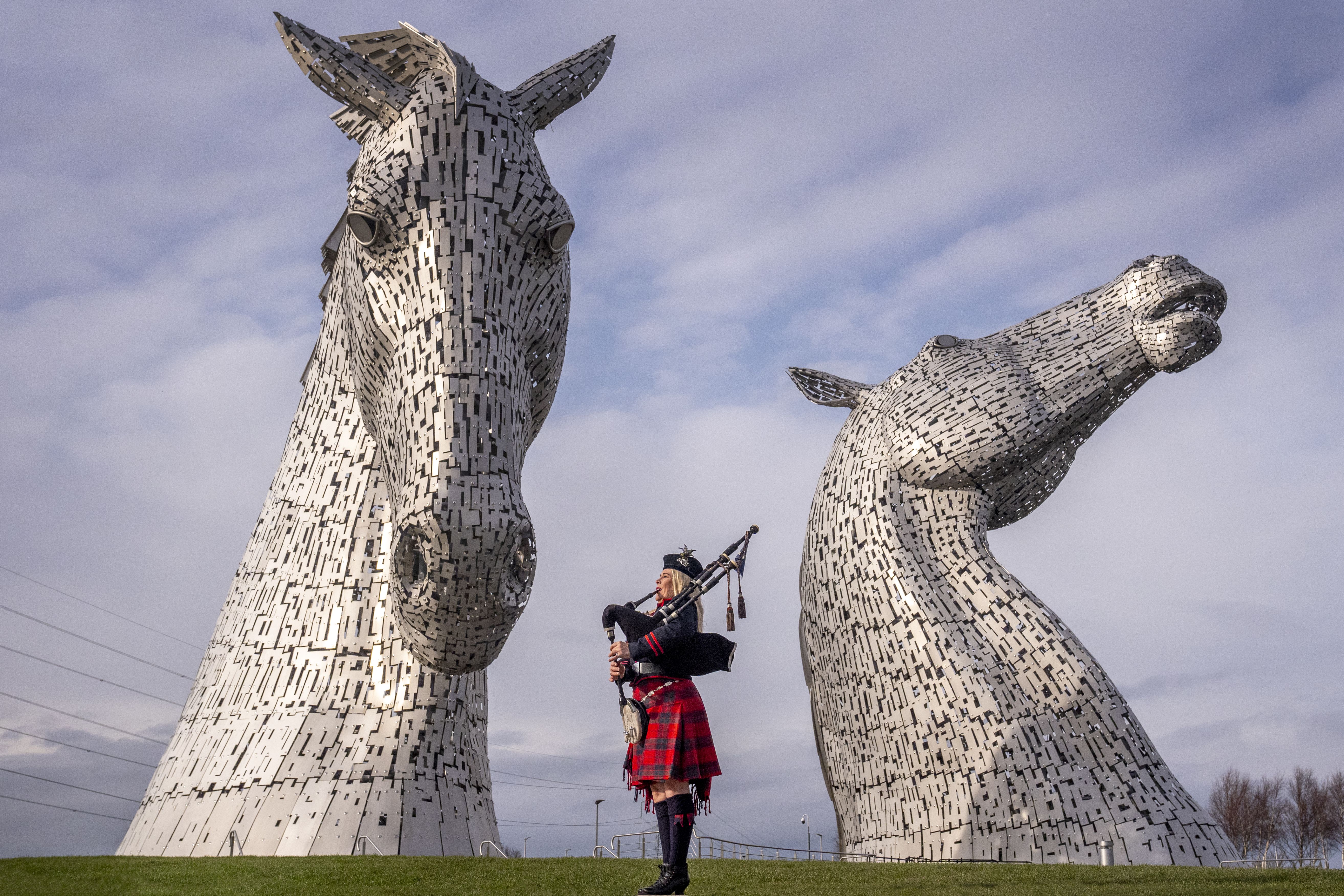 Scotland's National Piper Louise Marshall plays at The Kelpies in Falkirk, UK ahead of International Bagpipe Day on March 10 on Friday, March 7, 2025. (Photo by Jane Barlow/PA Wire)