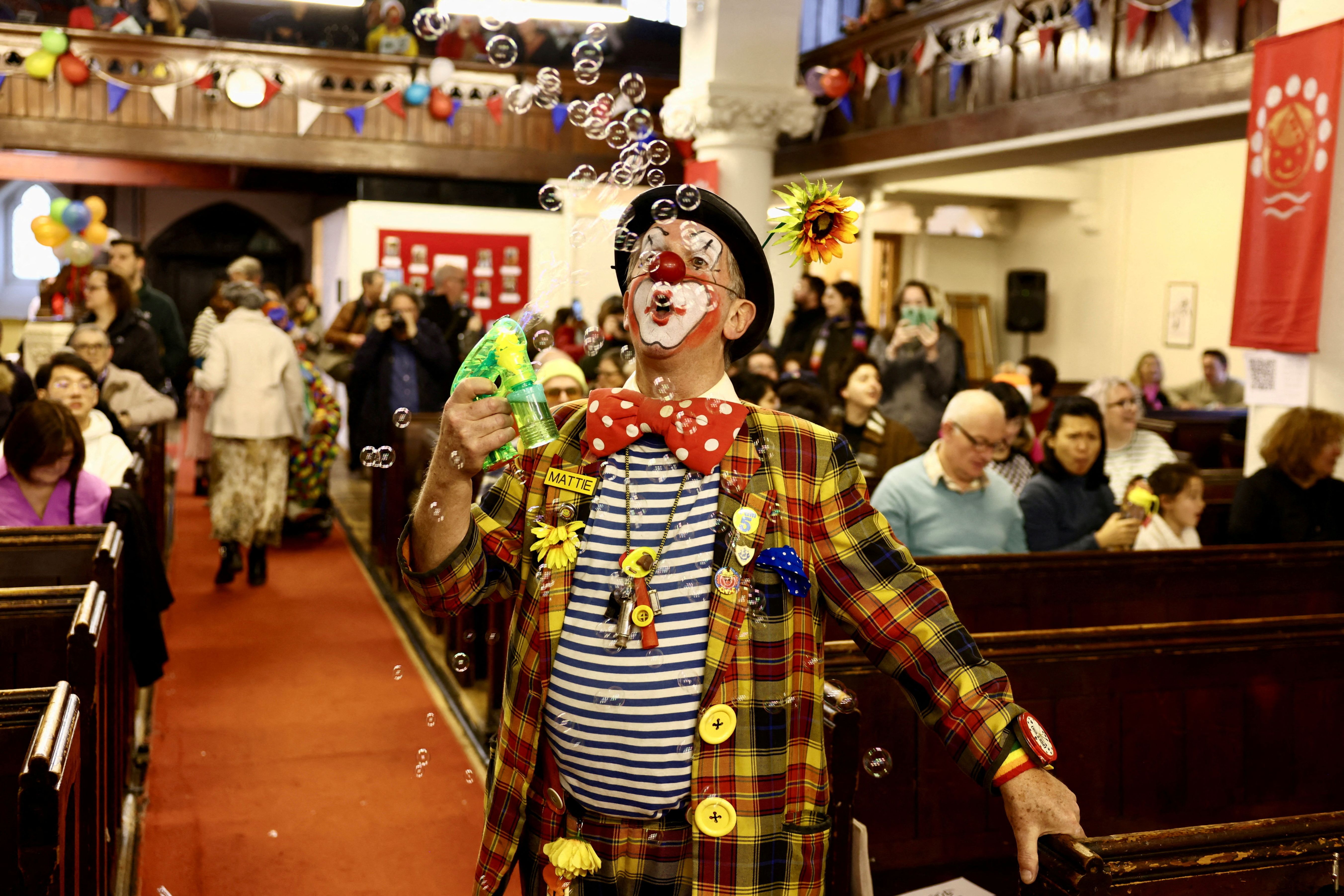 Mattie the clown blows bubbles as clowns and entertainers attend the annual service of remembrance in honour of British clown Joseph Grimaldi who died in 1837, at All Saints Church in Haggerston, London, Britain, on February 4, 2024. (Photo by Kevin Coombs/Reuters)