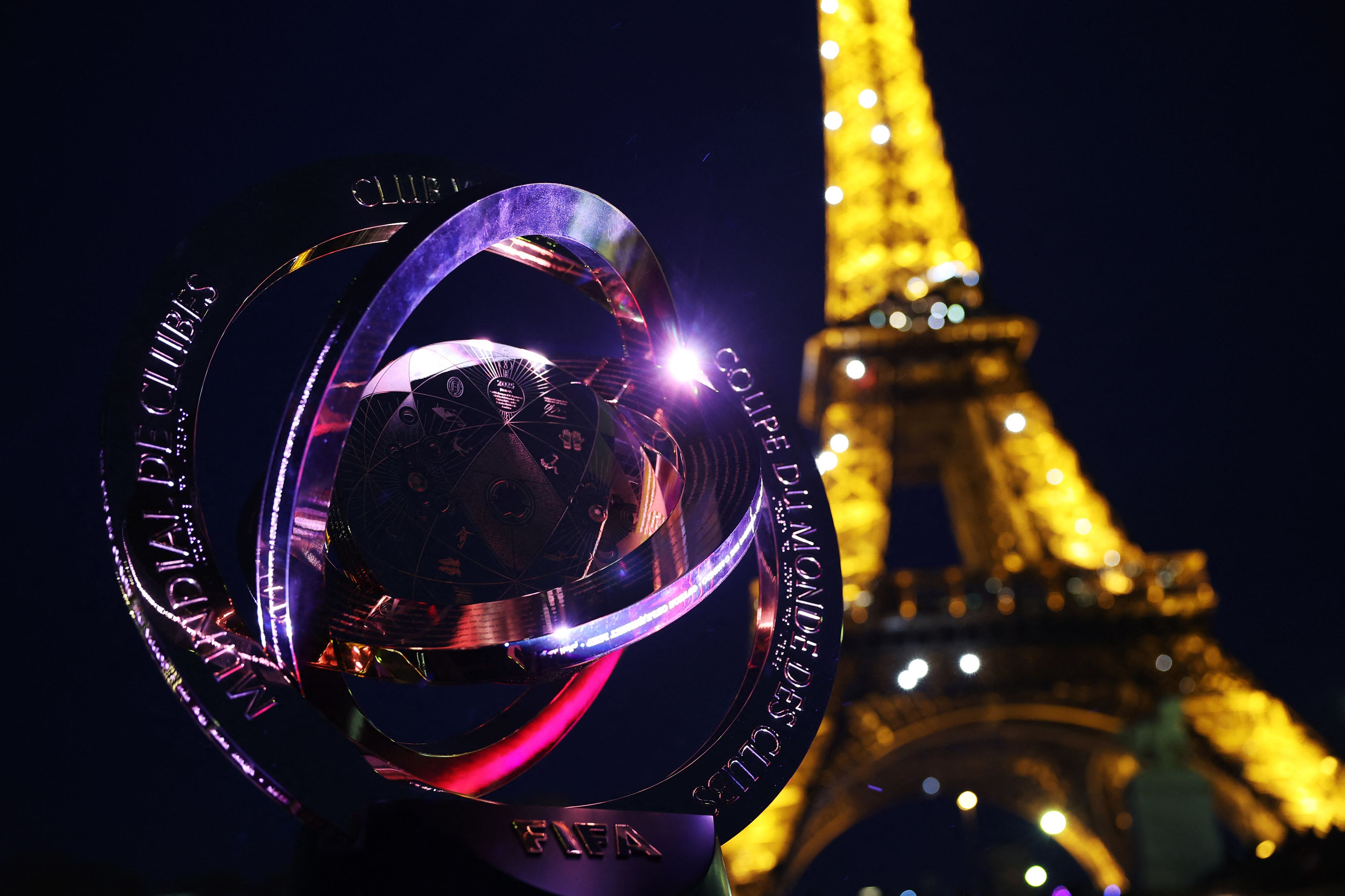 This photograph shows the FIFA Club World Cup trophy during a presentation aboard a riverboat on the Seine river, in front of the Eiffel Tower in Paris on April 3, 2025. (Photo by Franck Fife/AFP Photo)