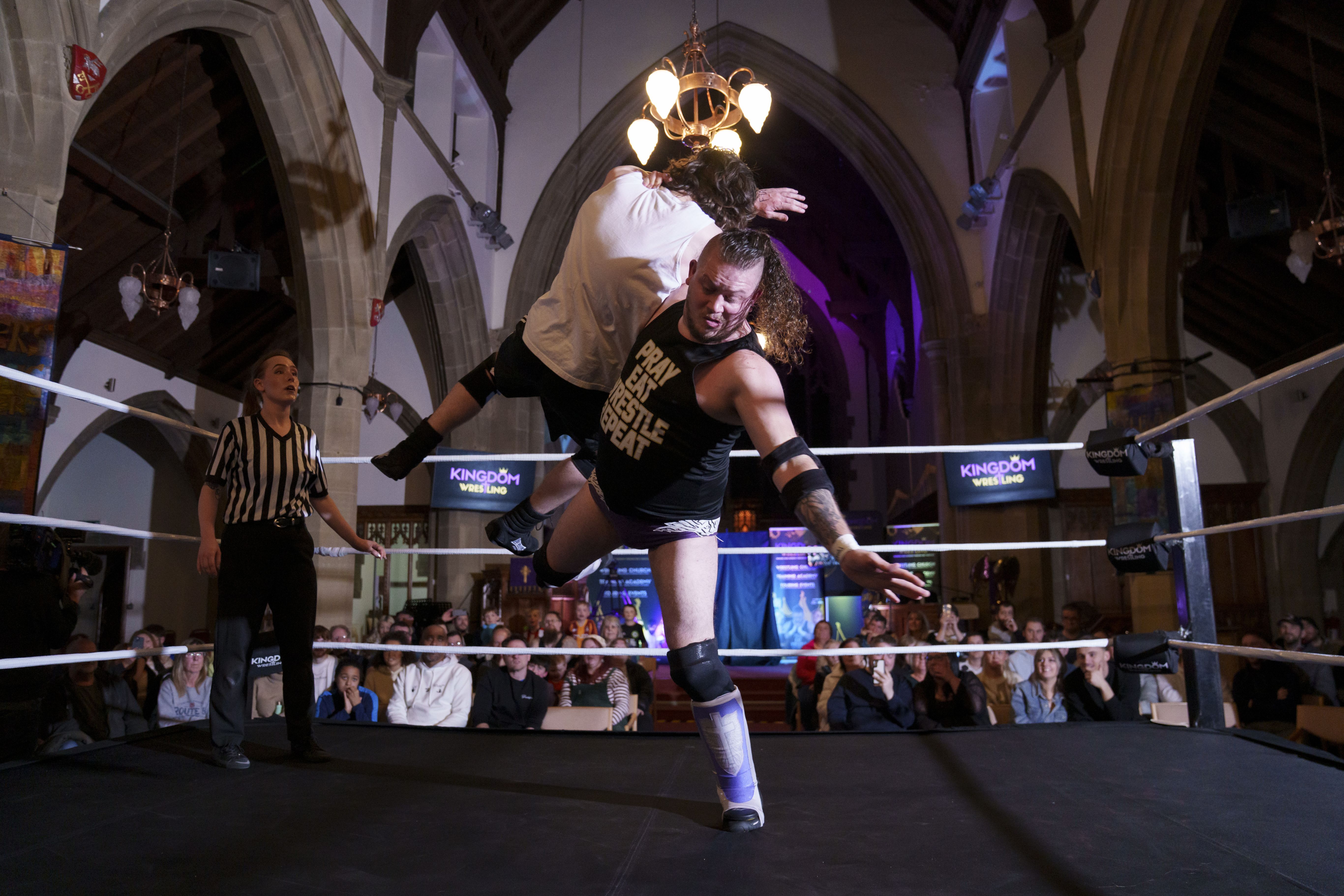 Gareth “Angel” Thompson body slams Young Johnty during a Kingdom Wrestling show at St Peter's Church in Shipley, Saturday, March 29, 2025. (Photo by Jon Super/AP Photo)