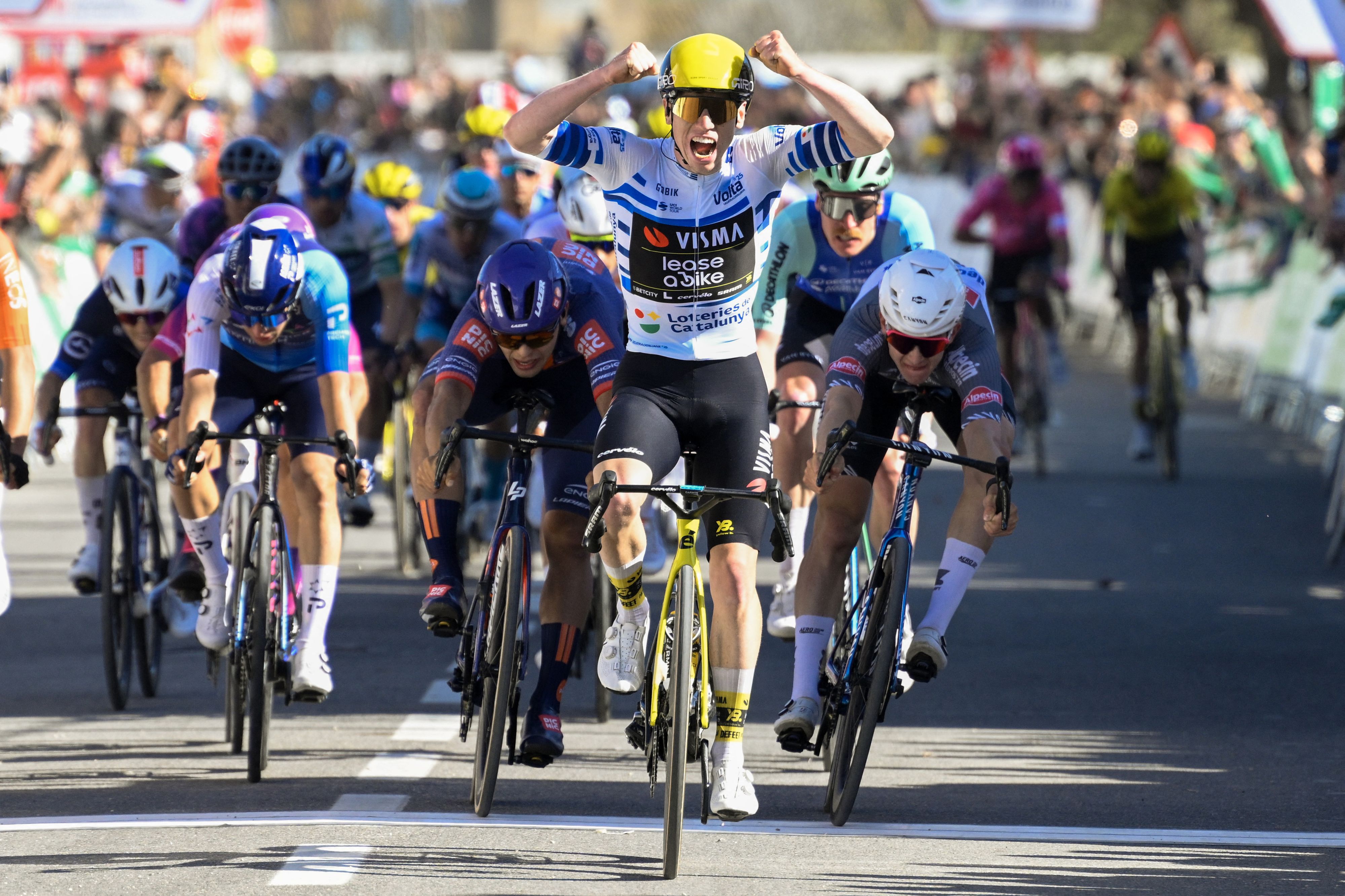 Team Visma-Lease a bike's Matthew Brennan celebrates as he crosses the finish line to win the 5th stage of the 2025 Volta a Catalunya cycling tour of Catalonia, a 172 km race between Pauls and Amposta, on March 28, 2025. (Photo by Josep Lago/AFP Photo)