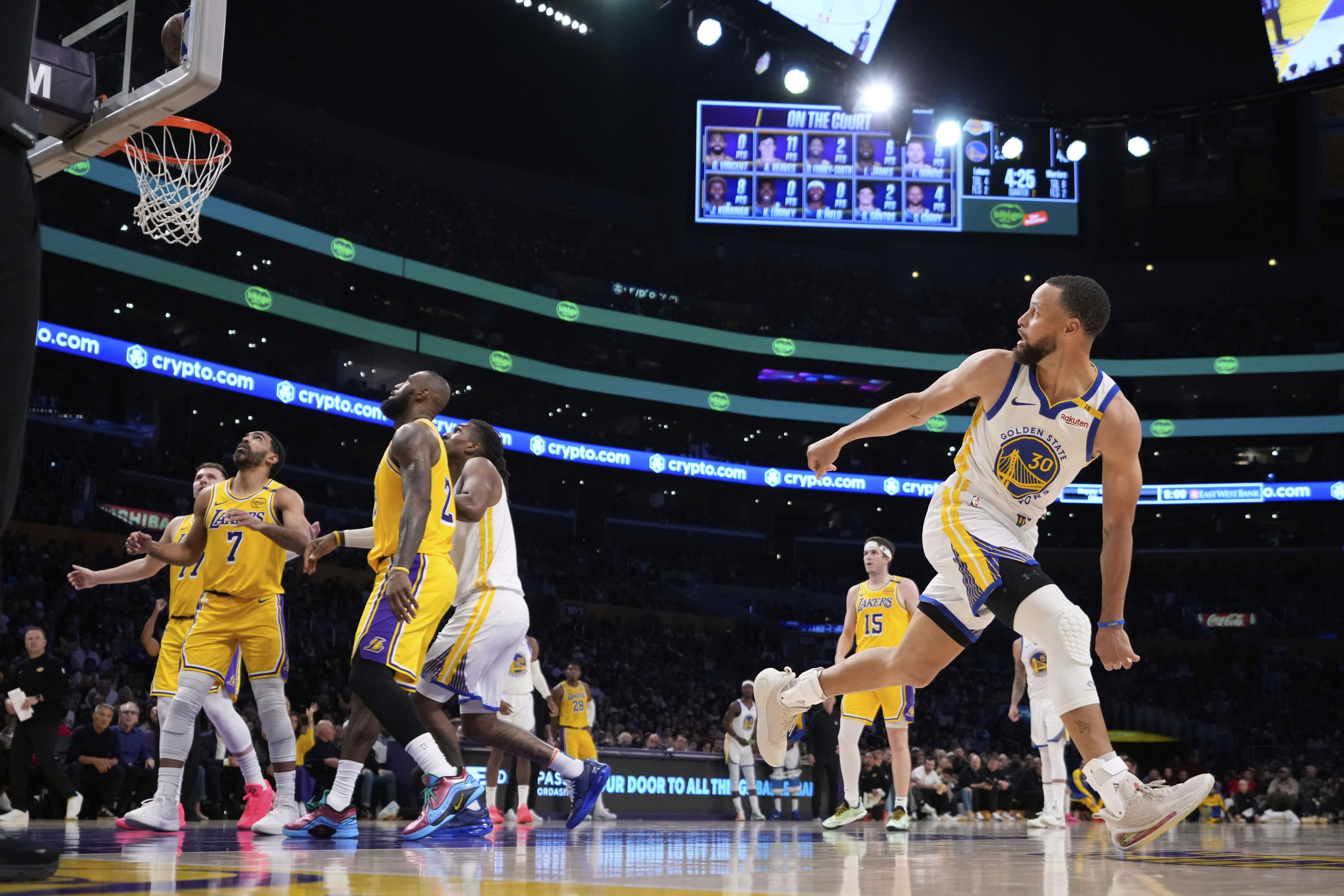 Golden State Warriors guard Stephen Curry, right, watches his shot go in during the first half of an NBA basketball game against the Los Angeles Lakers, Thursday, April 3, 2025, in Los Angeles. (Photo by Mark J. Terrill/AP Photo)