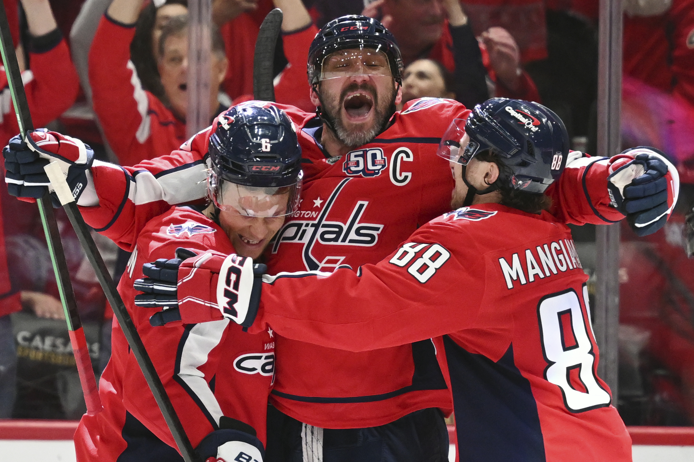 Washington Capitals left wing Alex Ovechkin (8) celebrates with Capitals defenseman Jakob Chychrun, left, and left wing Andrew Mangiapane after tying Wayne Gretzky’s 894 career goal record on this shot during the third period of an NHL hockey game against the Chicago Blackhawks at Capital One Arena in Washington, DC on April 4, 2025. (Photo by John McDonnell/For The Washington Post)