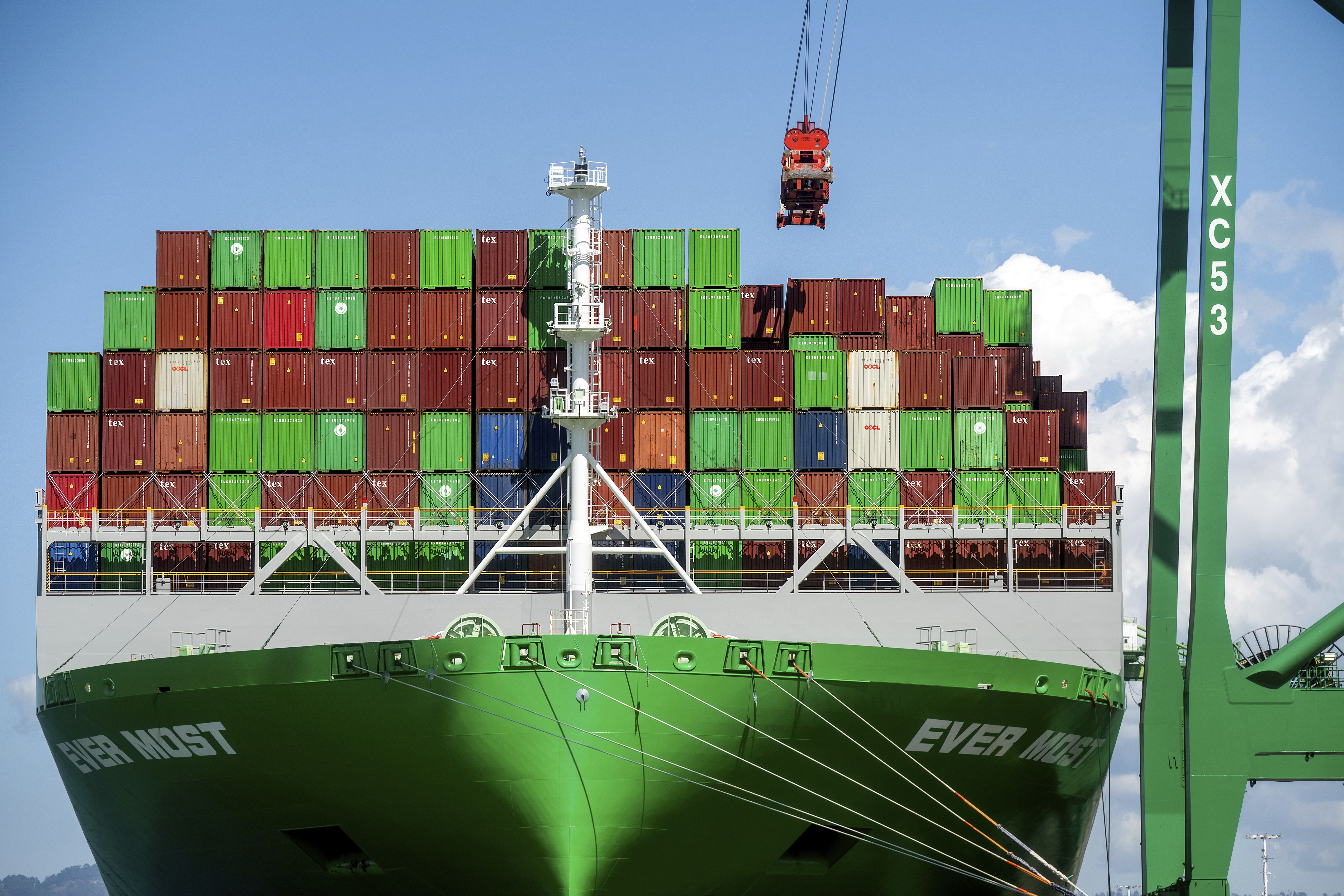 Shipping containers line the Ever Most cargo vessel docked at the Port of Oakland on Thursday, April 3, 2025, in Oakland, Calif. (Photo by Noah Berger/AP Photo)