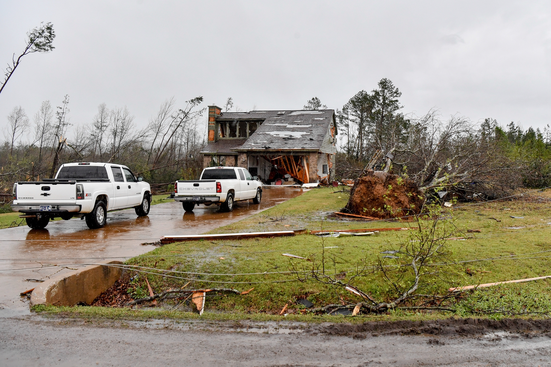 Downed trees and heavy structure damage are seen after tornadoes moved through the area on April 03, 2025 in Selmer, Tennessee. At least 5 people were reportedly killed during the severe storm which caused widespread destruction across the region. (Photo by Jason Davis/Getty Images)