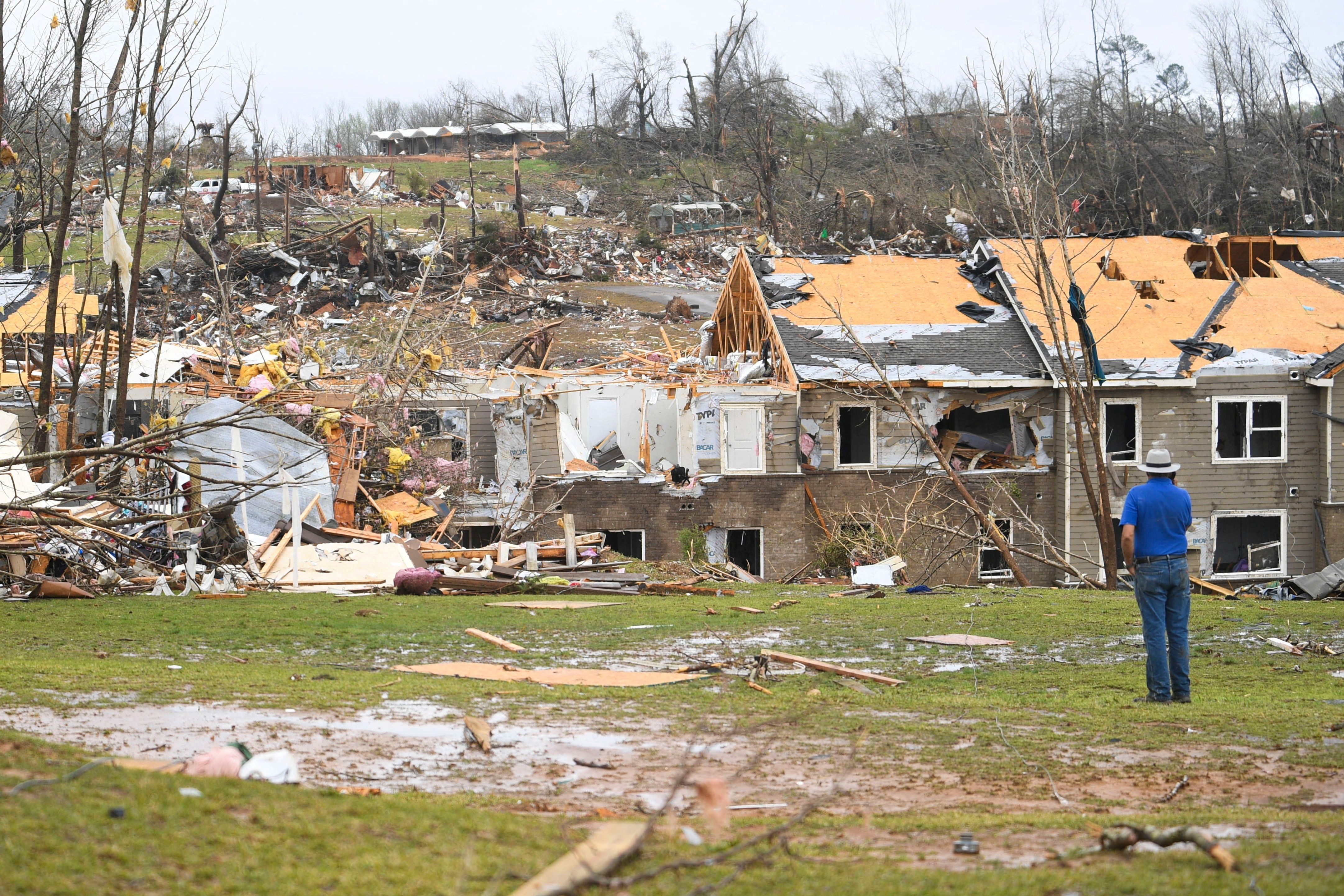 A man looks at debris on the ground after apartments were struck by a tornado in Selmer, Tennessee, U.S., April 3, 2025. (Photo by Jamar Coach/The Jackson Sun/USA TODAY NETWORK via Imagn Images)