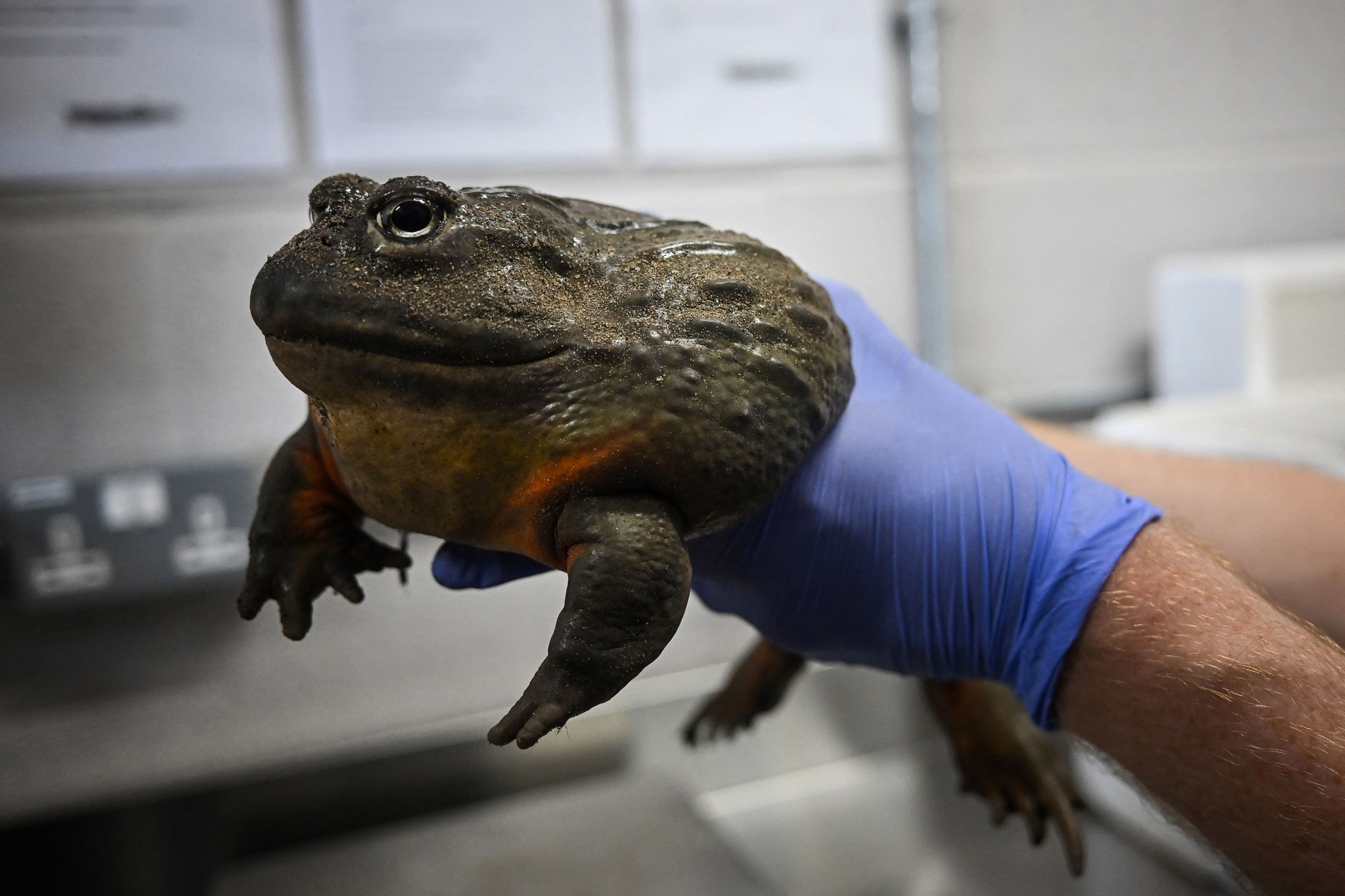 An African bullfrog, named Trevor, is removed from his tank and weighed during a preview of the new “Heart of Africa” area of Chester Zoo in Chester, north west England, on March 31, 2025. The area is the new home to 57 African species including northern giraffes, zebras, meercats and rhinos. (Photo by Paul Ellis/AFP Photo)