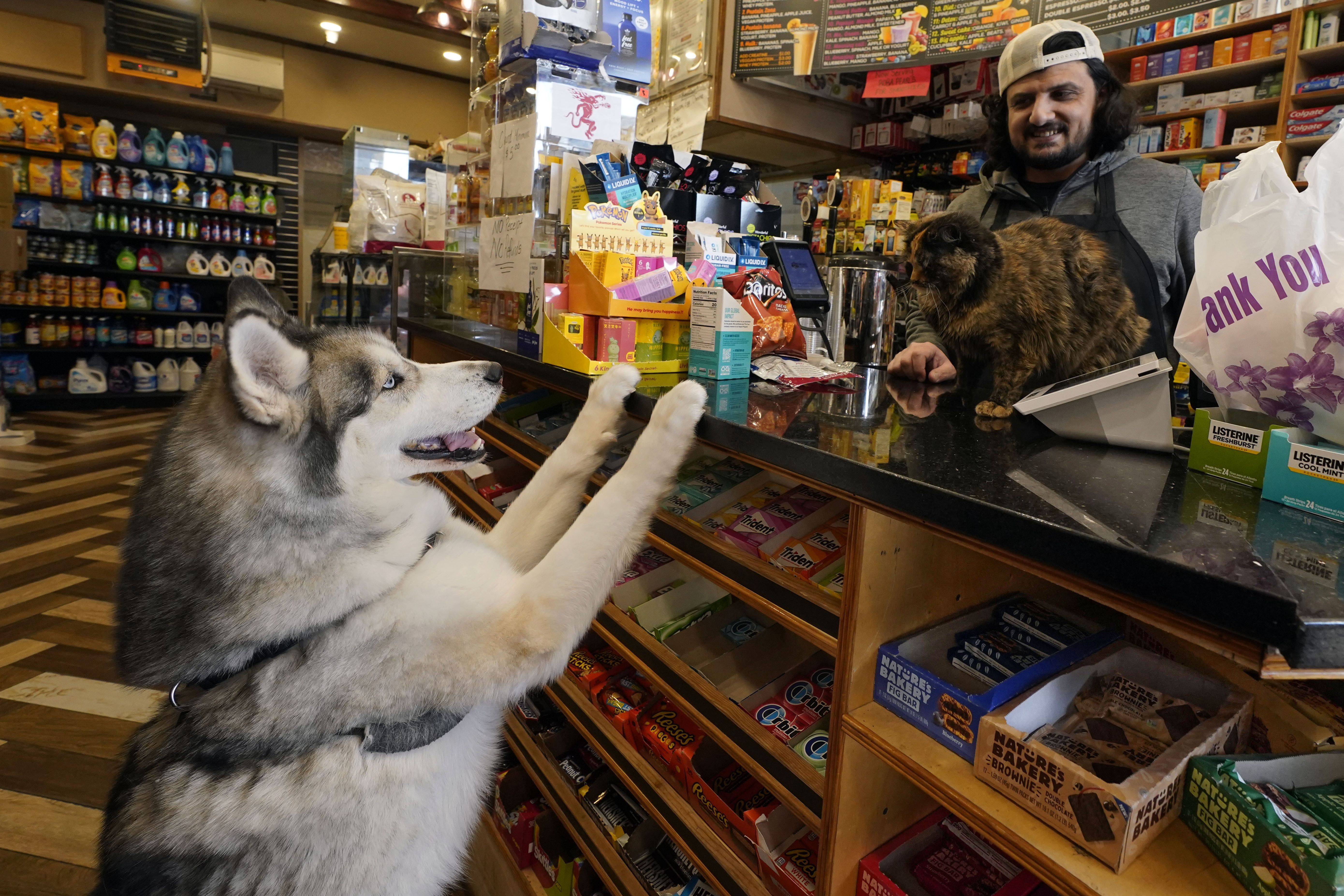 Canine, Ziggy Stardust, left, visits bodega cat Diamond, right, and employee Waled Yafaee at Apple Eats in the Williamsburg neighborhood of the Brooklyn borough of New York, Friday, March 14, 2025. (Photo by Richard Drew/AP Photo)