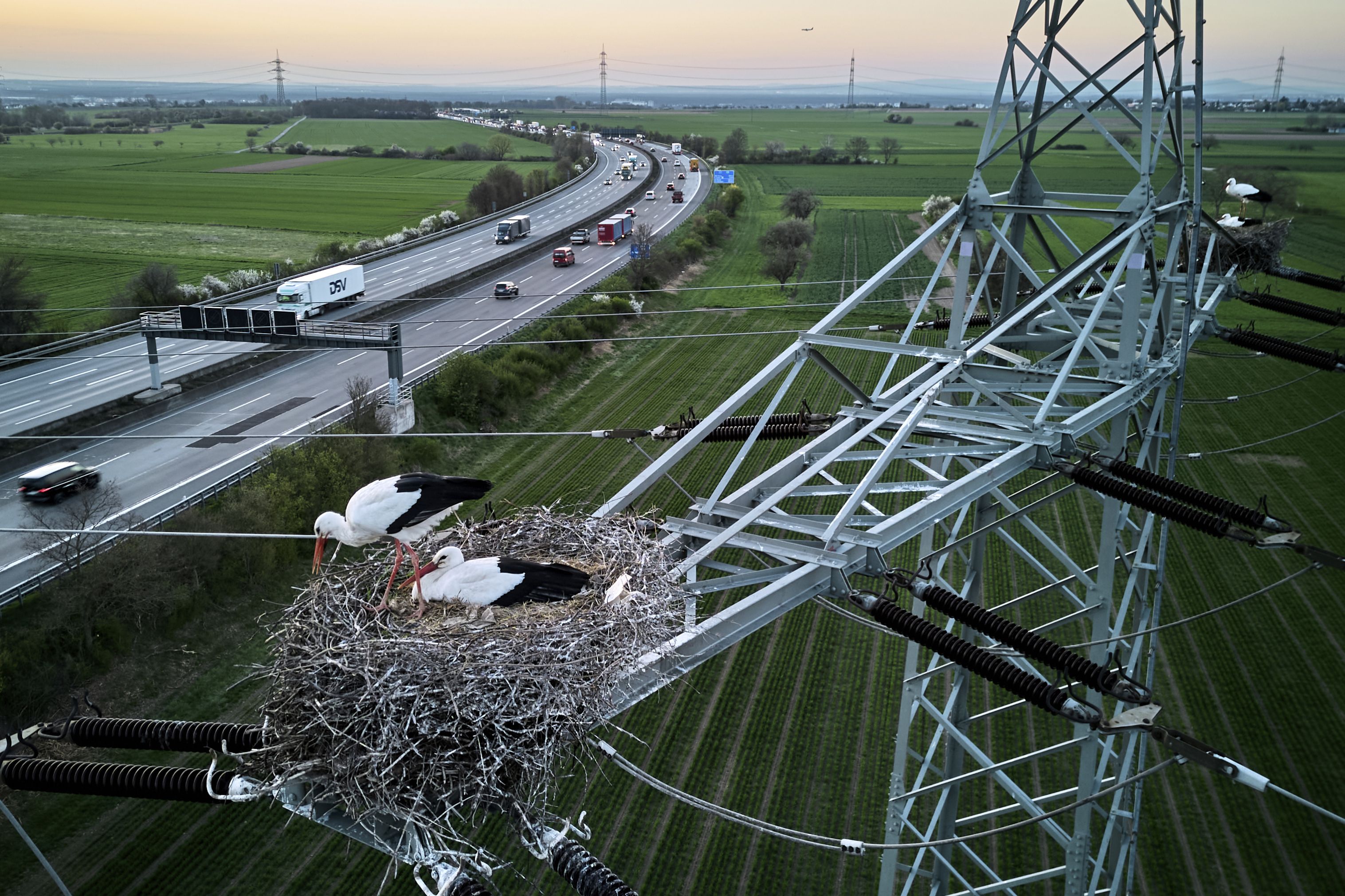 Storks sit in their nests on a power pole on the outskirts of Frankfurt, Germany, as a plane passes by on Wednesday, April 2, 2025. (Photo by Michael Probst/AP Photo)