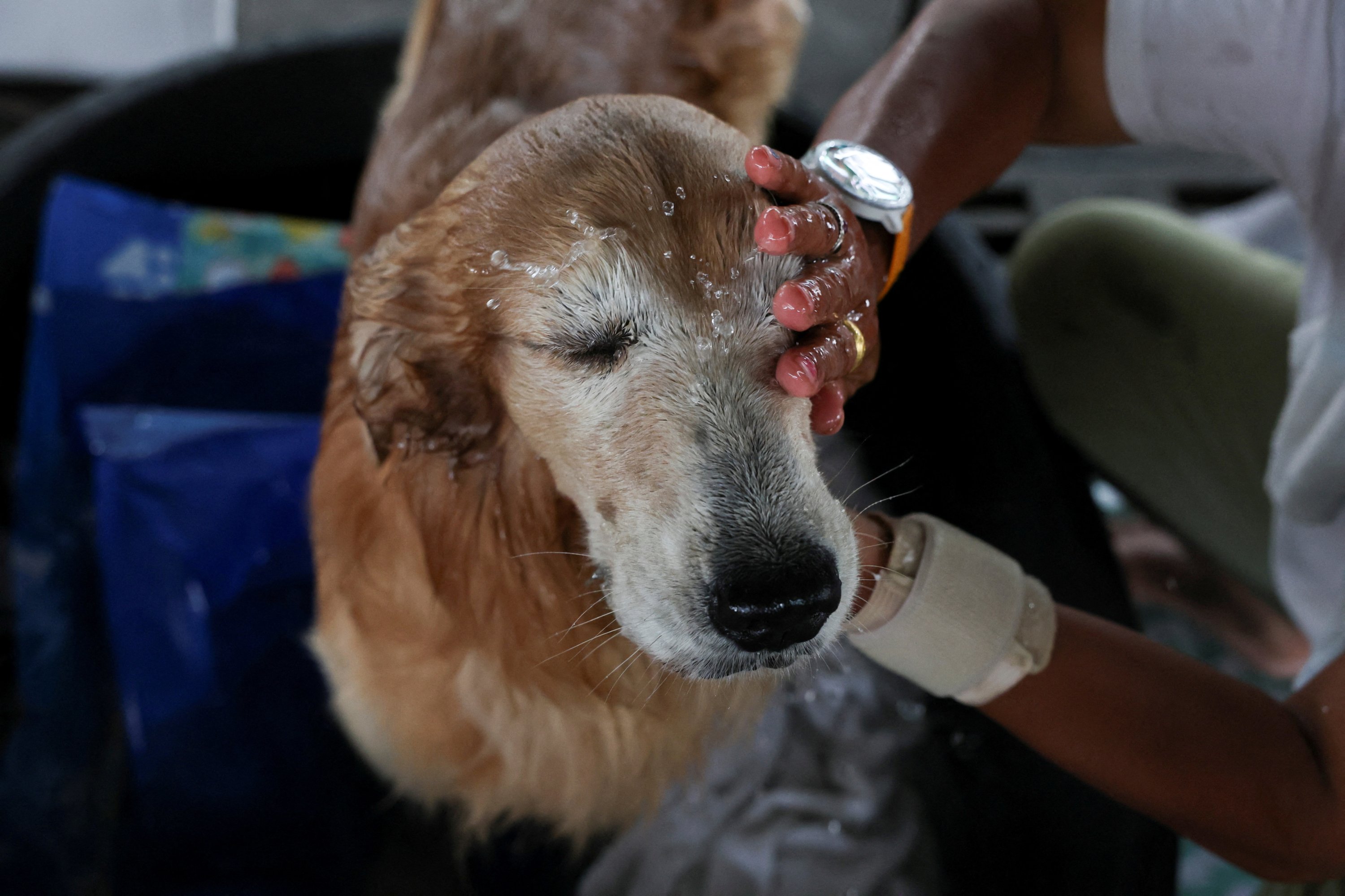 Safari, a 5-year-old K-9 dog of the Thailand Rescue Dog Association gets a cold bath to keep its temperature down during a search operation, following a strong earthquake, in Bangkok, Thailand, on March 31, 2025. (Photo by Chalinee Thirasupa/Reuters)