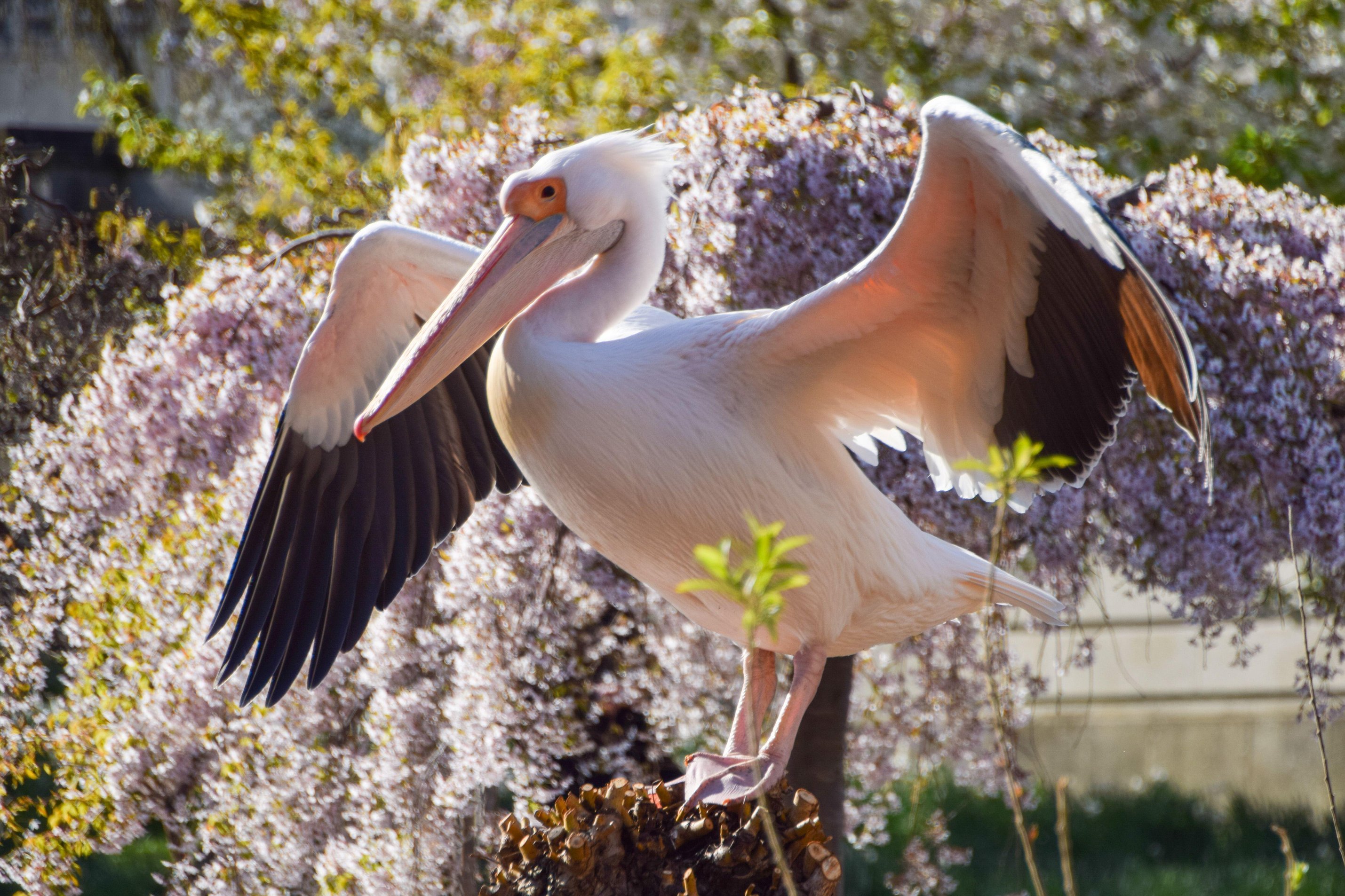 A resident great white pelican basks in the spring sunshine on a tree stump in St James's Park in London, England on April 2, 2025. (Photo by Vuk Valcic/ZUMA Press Wire/Alamy Live News)