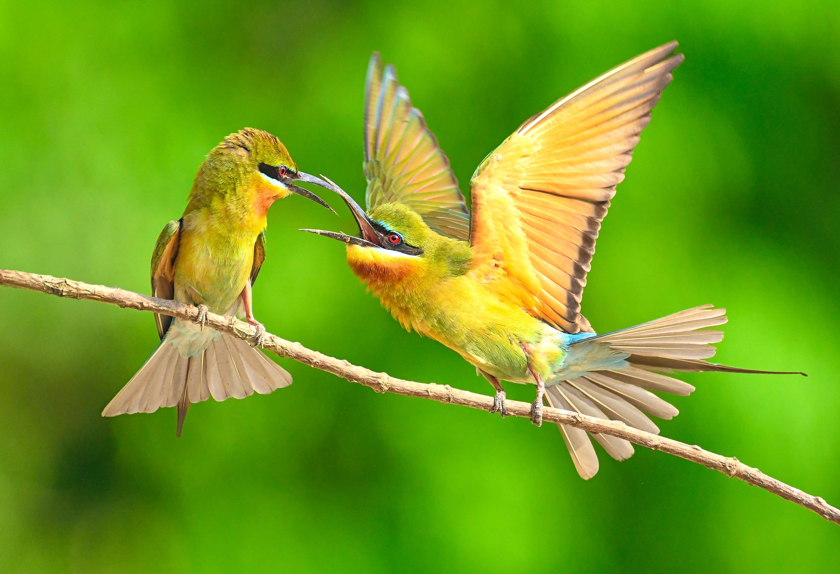 A dramatic aerial duel unfolds as two blue-tailed bee-eaters clash mid-air, battling for dominance and the attention of a female. The birds were photographed in Khishma Forest, West Bengal, India early April 2025. (Photo by Prasenjit Dutta/Solent News & Photo Agency)