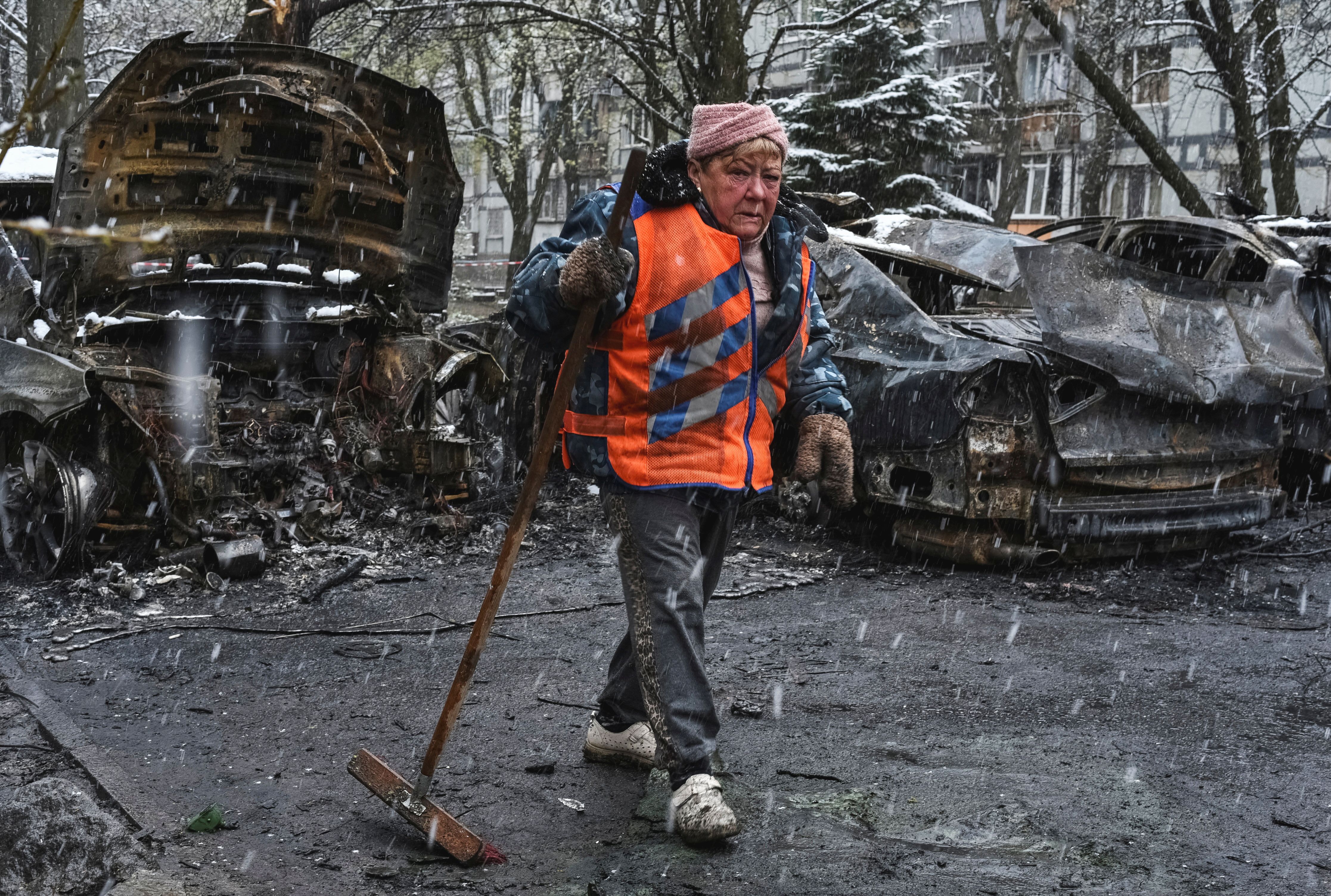 A municipal worker cleans an area at the site of Russian drone strike, amid Russia's attack on Ukraine, in Dnipro, Ukraine on April 9, 2025. (Photo by Mykola Synelnykov/Reuters)