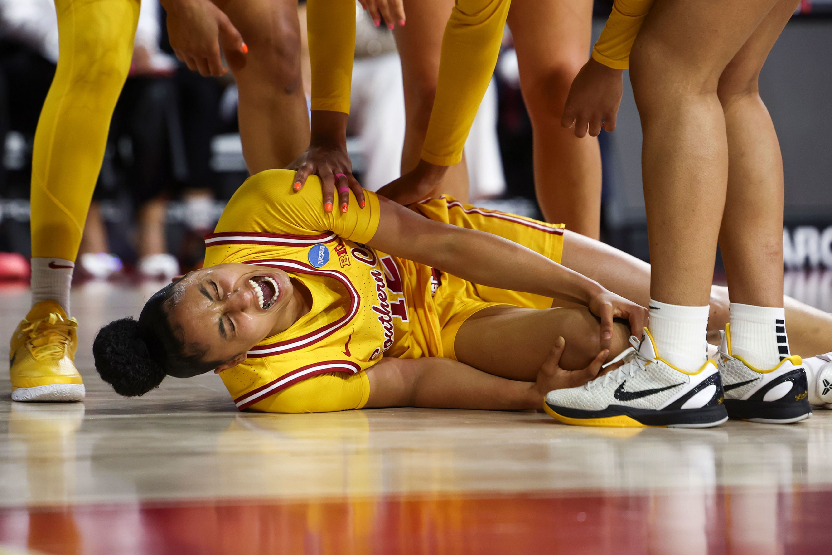 USC superstar basketball player JuJu Watkins holds her knee in agony after she injured it during an NCAA Tournament game on Monday, March 24, 2025. She will miss the rest of the tournament. (Photo by Jessie Alcheh/AP Photo)