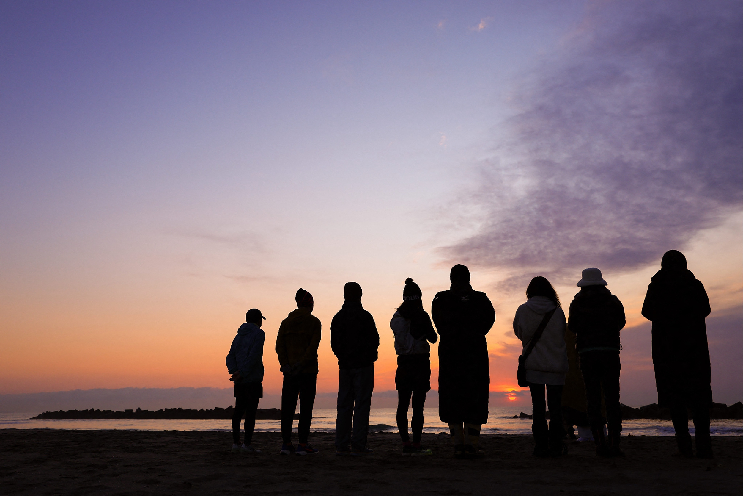 People watch the sunrise at the beach in Sendai's Wakabayashi Ward, Miyagi Prefecture on March 11, 2025, on the 14th anniversary of the magnitude 9.0 earthquake which triggered a tsunami and nuclear disaster. (Photo by JIJI Press/AFP Photo)