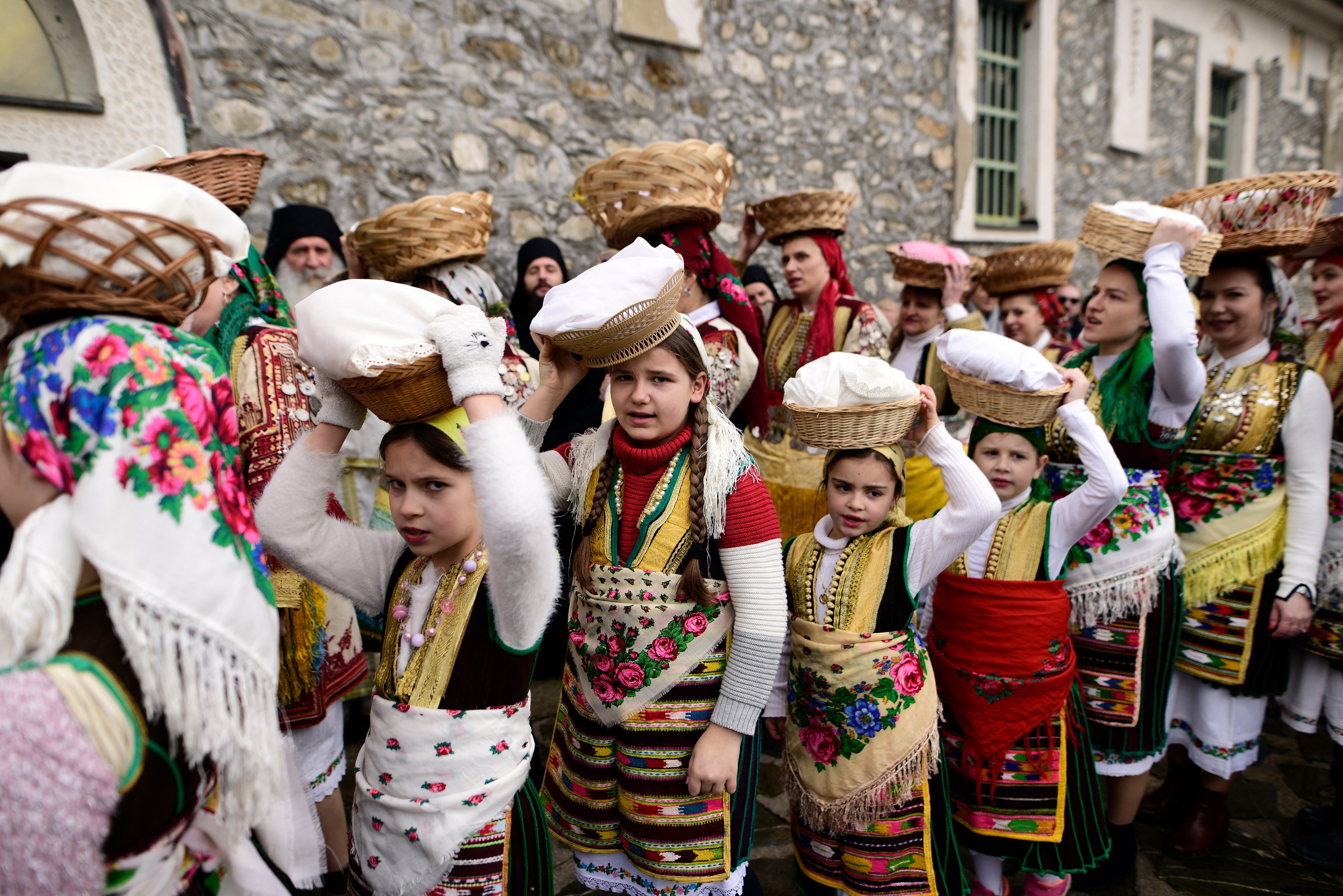 Women dressed in traditional folk costumes participate at the Epiphany day celebrations in the village of Bitushe, some 50km south-west of Gostivar, North Macedonia, on January 19, 2024. (Photo by Robert Atanasovski/AFP Photo)