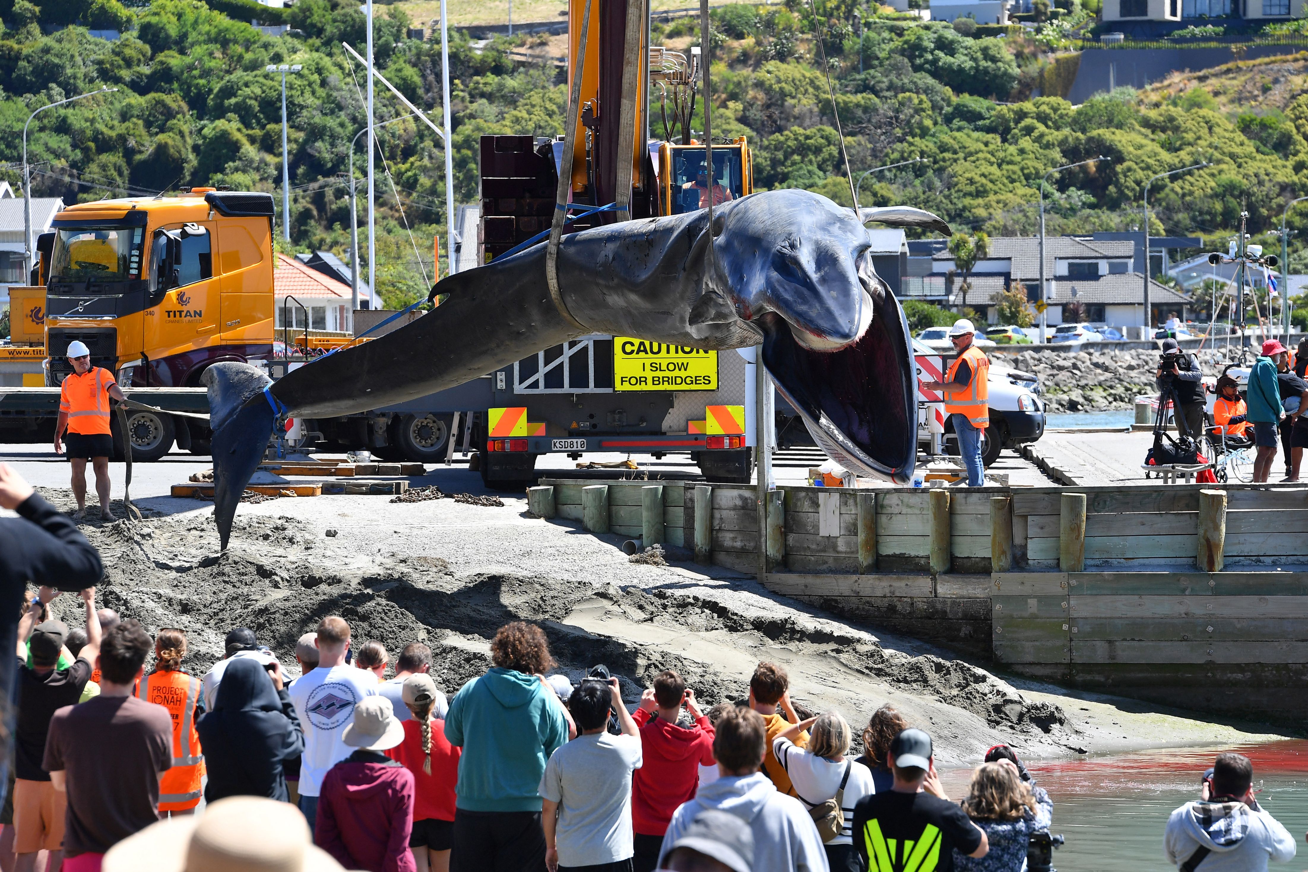 Rescuers retrieve the carcass of a stranded fin whale in Christchurch on January 29, 2024. The whale, which had been stranded off the coast of Moncks Bay on January 28, died in the early morning. (Photo by Sanka Vidanagama/AFP Photo)