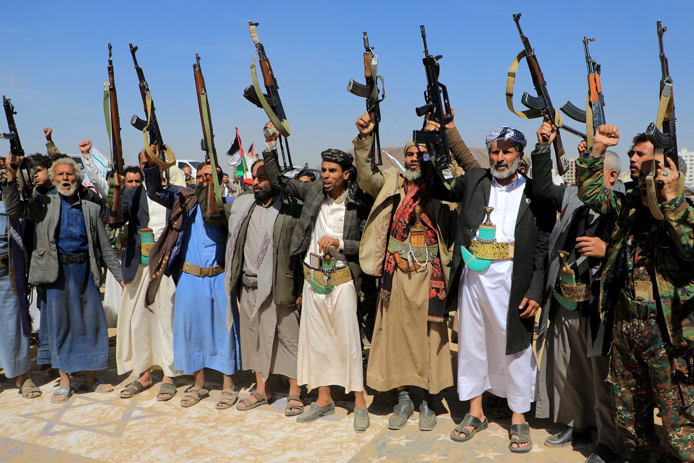 Armed supporters of Yemen's Huthi rebels attend a rally in solidarity with the the Palestinian Hamas movement's armed resistance against Israel in the capital Sanaa on January 29, 2024, amid the continuing battles between Israeli forces and Hamas in Gaza. Since shortly after the Israel-Hamas war in Gaza broke out on October 7, the Huthis have launched a spate of missile and drone attacks on passing commercial ships in the Red Sea which they say are linked to Israel. (Photo by Mohammed Huwais/AFP Photo)