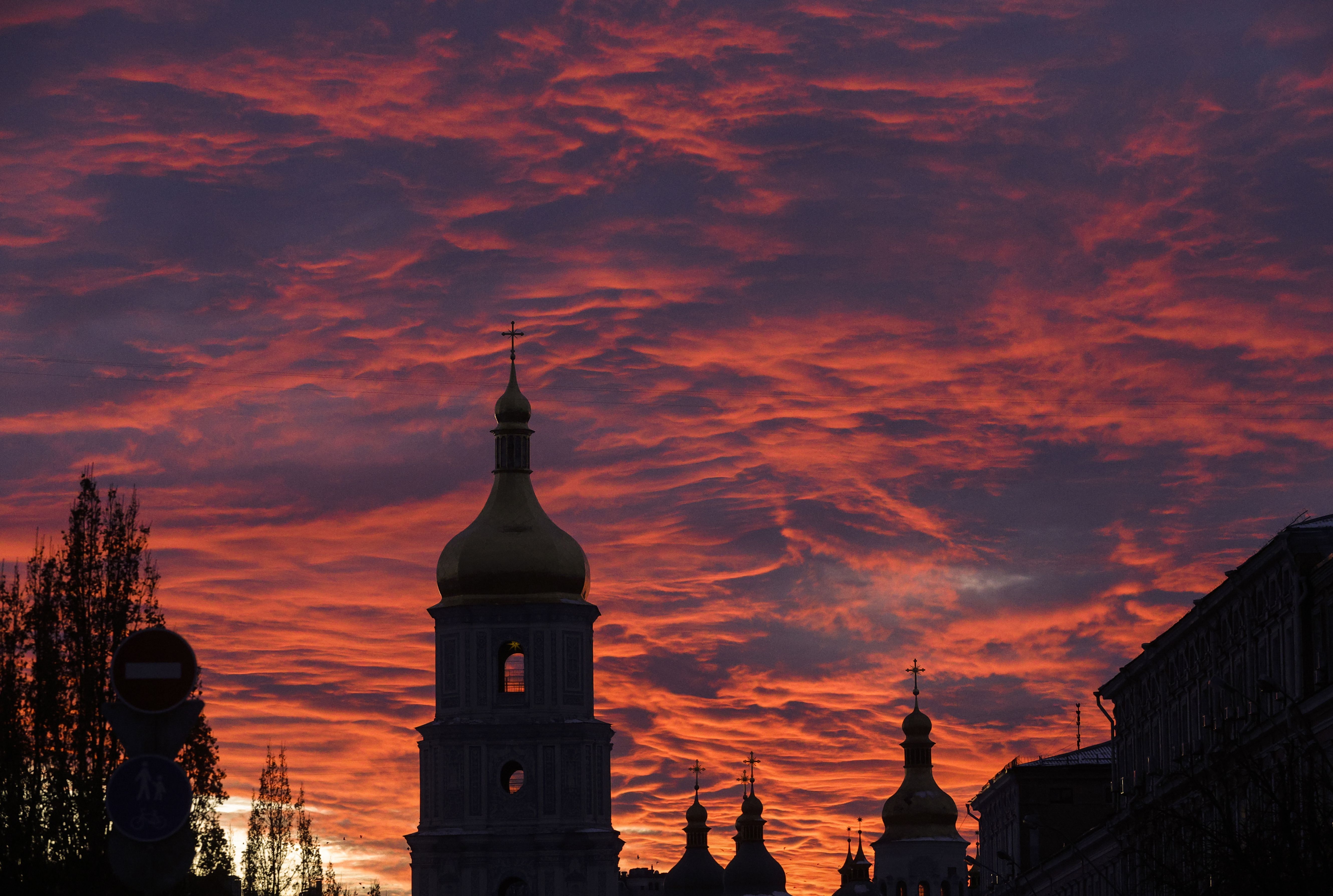 The sun sets above the St. Sophia Cathedral in downtown Kyiv, Ukraine, 14 January 2025. (Photo by Sergey Dolzhenko/EPA/EFE)