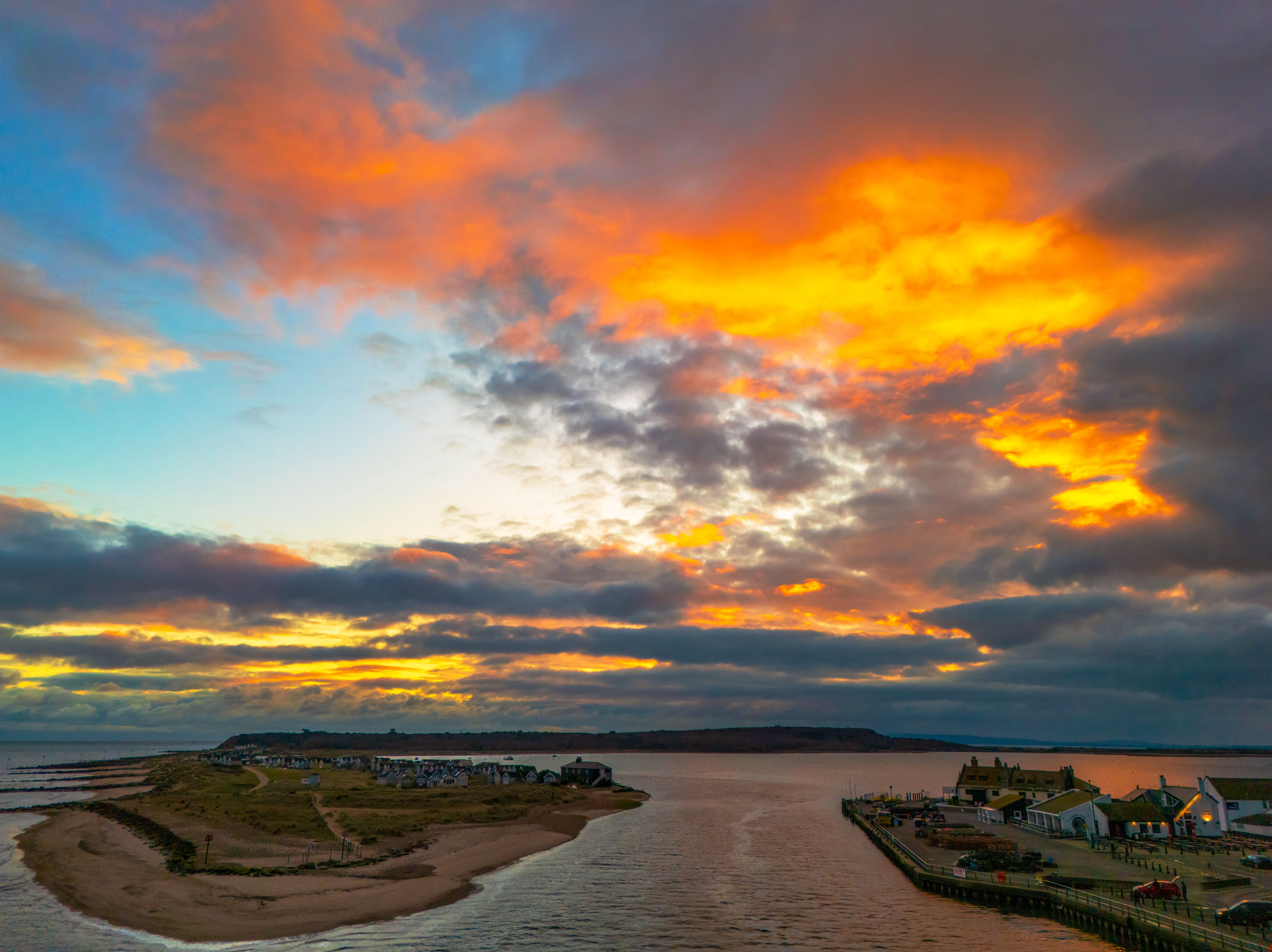 An aerial view of a spectacular sunset over Mudeford Sandbank and Christchurch Harbour, Dorset, UK on February 10, 2025, captured by photographer Steve Hogan. (Photo by SteveHogan/Bournemouth News)