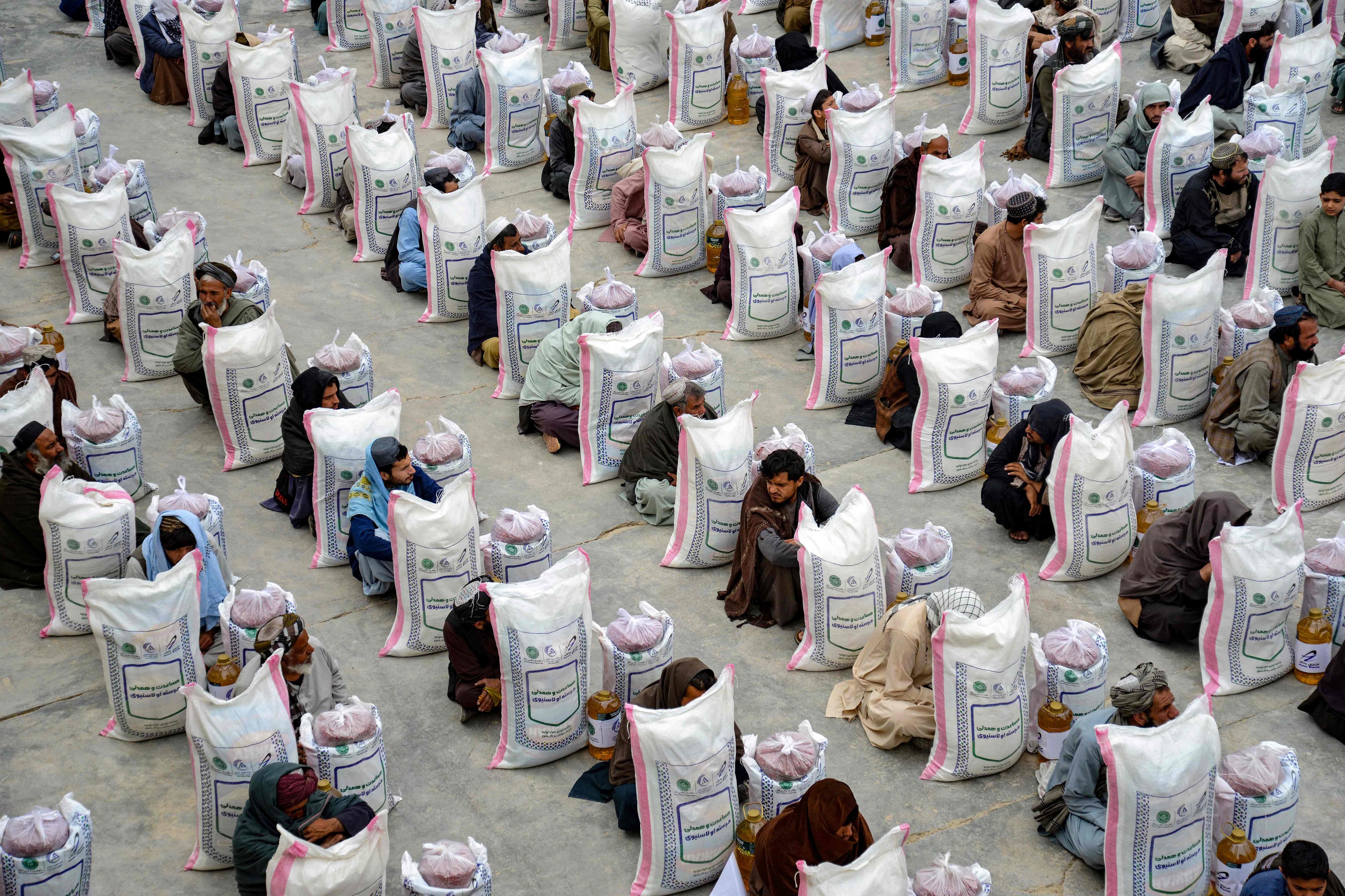 Afghans receive sacks of food aid donated by a charity during the Islamic holy fasting month of Ramadan in Kandahar on March 9, 2025. (Photo by Sanaullah Seiam/AFP Photo)
