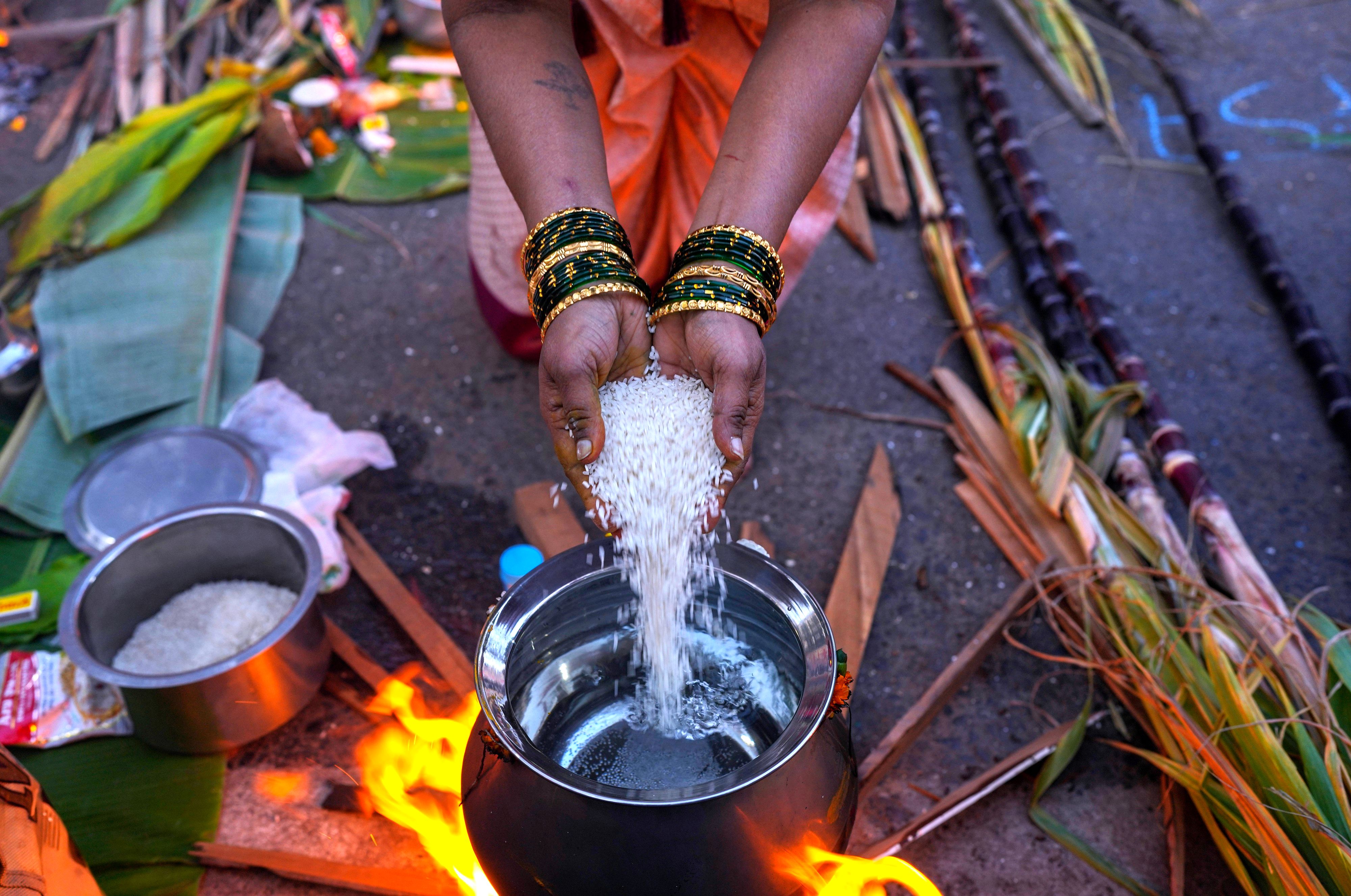 An Indian Tamil Hindu woman cooks special food to celebrate harvest festival Pongal at Dharavi, one of the world's largest slums, in Mumbai, India, Monday, January 15, 2024. This celebration, held according to the solar calendar, marks the beginning of the sun's northward movement and is considered to be auspicious. (Photo by Rafiq Maqbool/AP Photo)