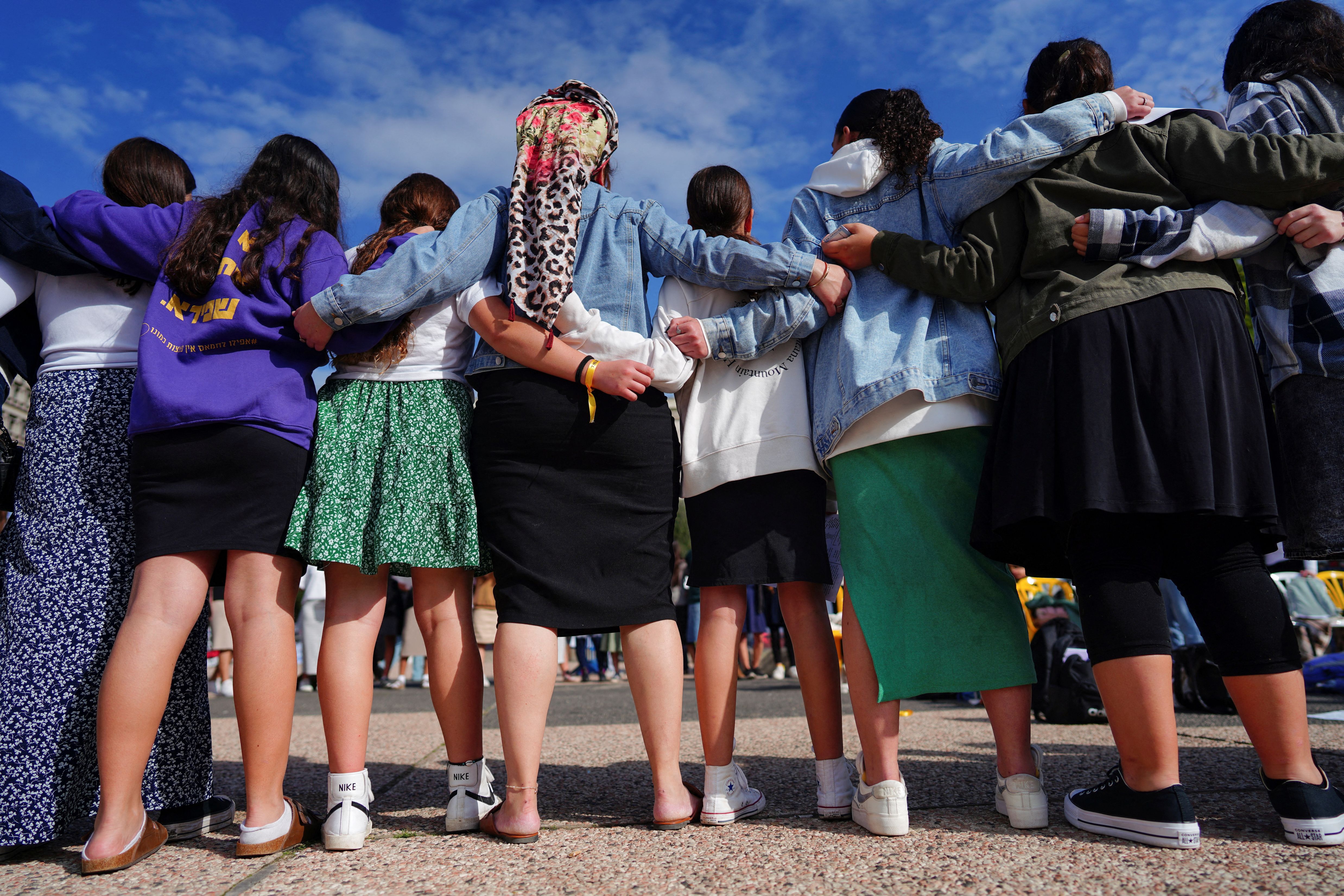 Israeli teenagers sing the national anthem, as faculty and representatives from the University of Pennsylvania visit a plaza, in support of the families of hostages kidnapped on the October 7 attack, in Tel Aviv, Israel on January 4, 2024. (Photo by Alexandre Meneghini/Reuters)