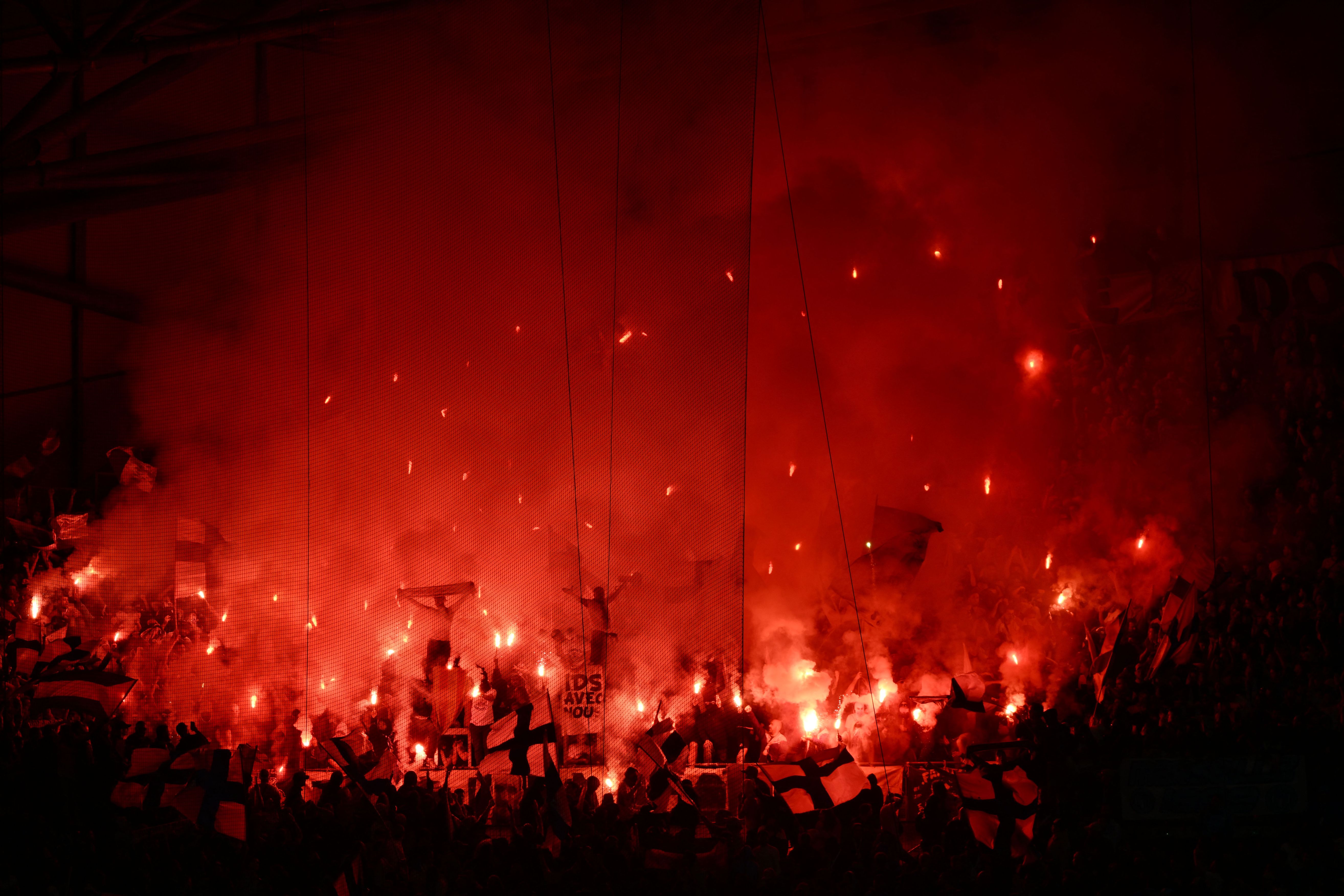 Marseille's fans celebrate their victory 3-2 at the end of their ligue 1 football match Olympique de Marseille (OM) vs Toulouse FC at the Velodrome stadium in Marseille on 06 April, 2025. (Photo by Christophe Simon/AFP Photo)