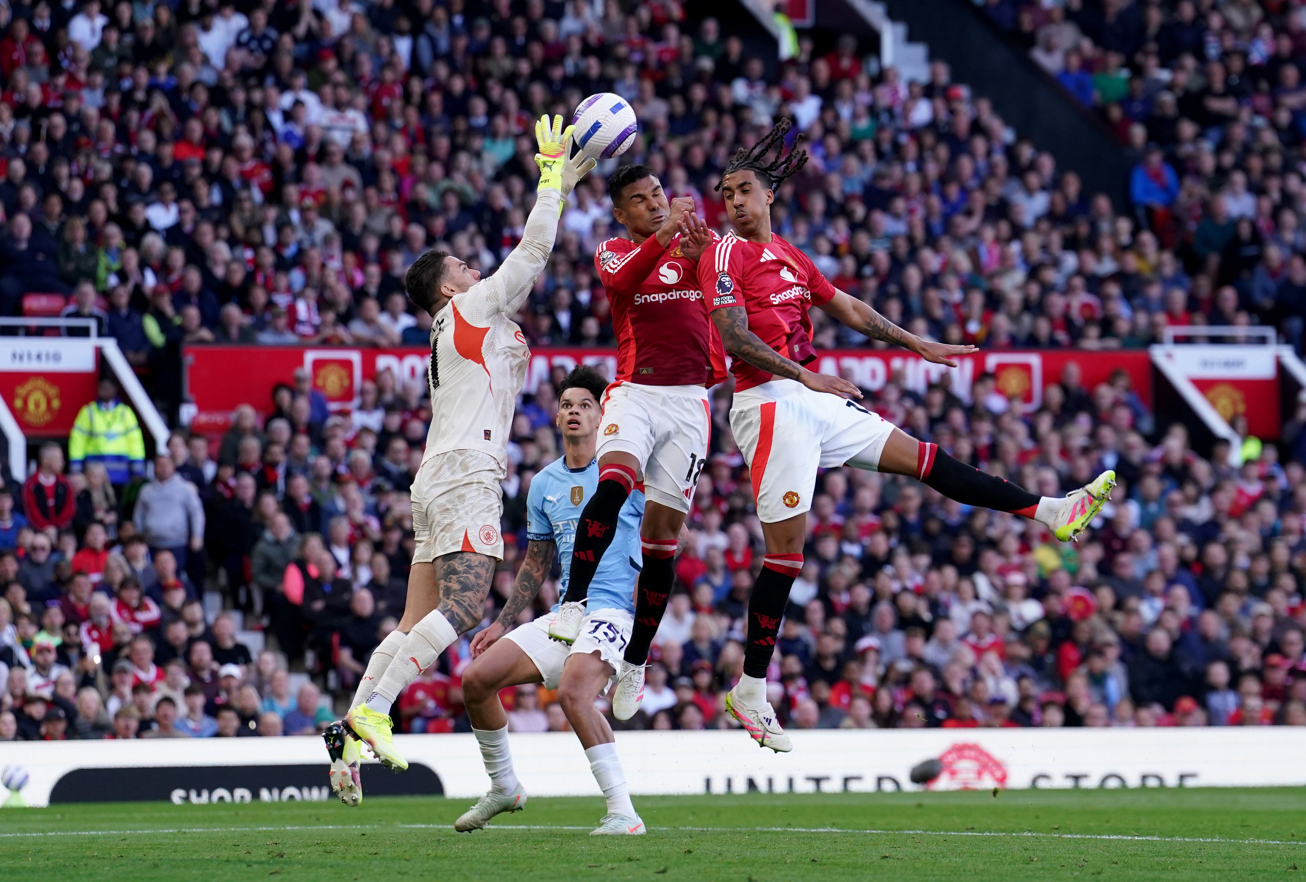 Manchester United's Casemiro (centre) and Leny Yoro (right)challenge Manchester City goalkeeper Ederson (left) for the ball during the Premier League match at Old Trafford, Manchester on Sunday, April 6, 2025. (Photo by Martin Rickett/PA Wire)