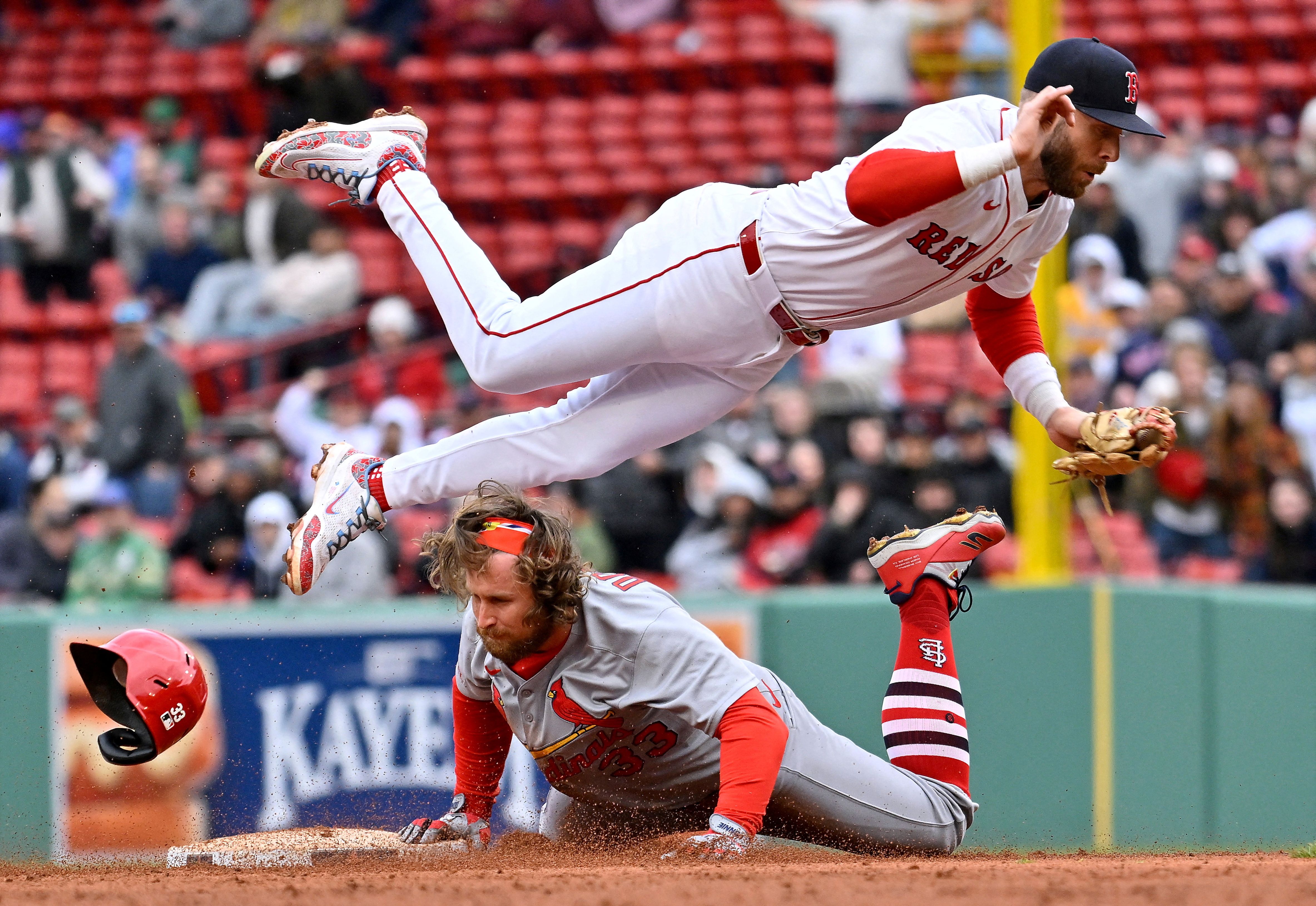 Boston Red Sox shortstop Trevor Story (10) leaps out of the way as St. Louis Cardinals infield Brendan Donovan (33) continues to slide into second base during the ninth inning at Fenway Park in Boston, Massachusetts on April 6, 2025. (Photo by Eric Canha/Reuters)