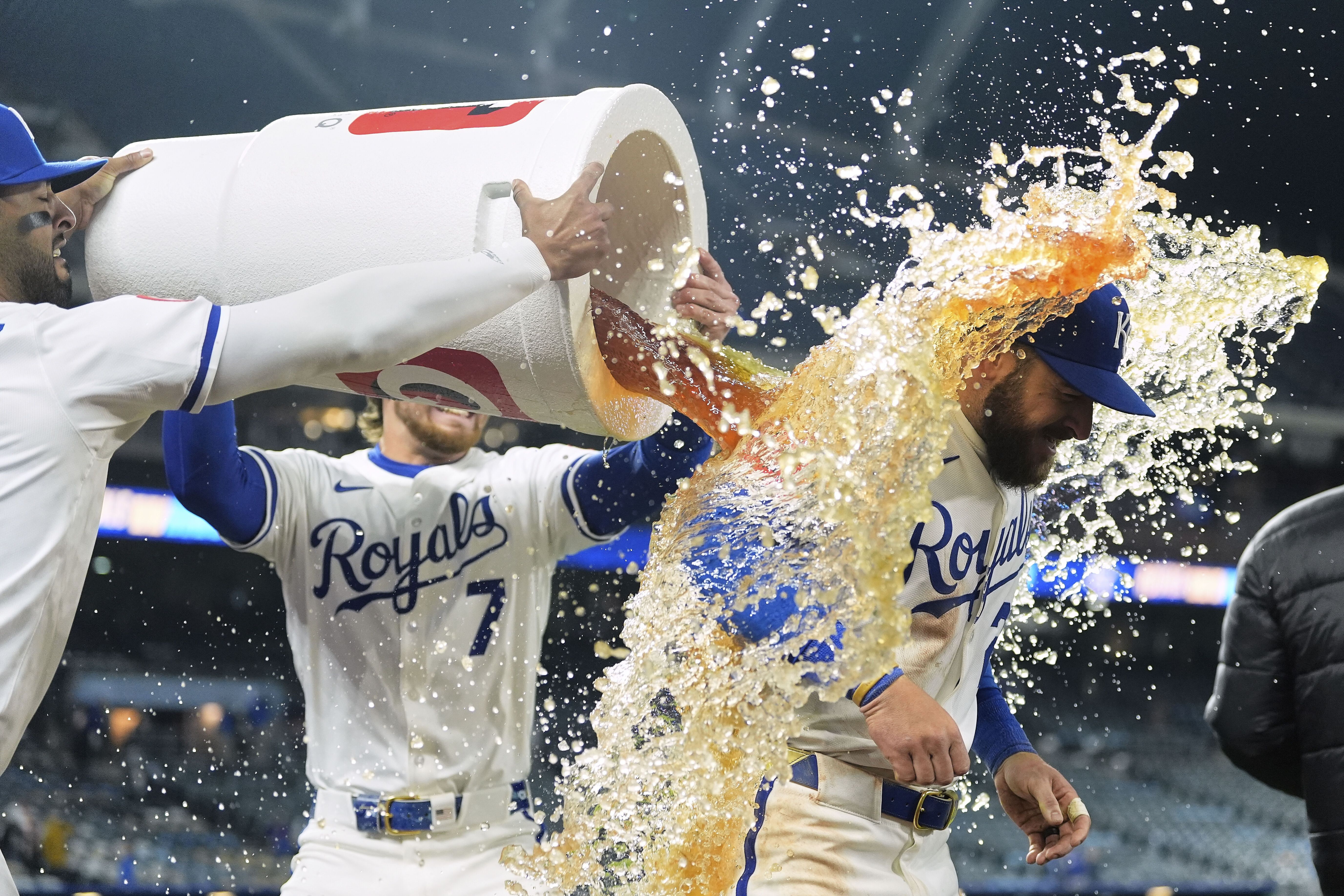 Kansas City Royals' Kyle Isbel is doused by MJ Melendez, left, and Bobby Witt Jr. (7) after a baseball game against the Minnesota Twins, Monday, April 7, 2025, in Kansas City, Mo. (Photo by Charlie Riedel/AP Photo)