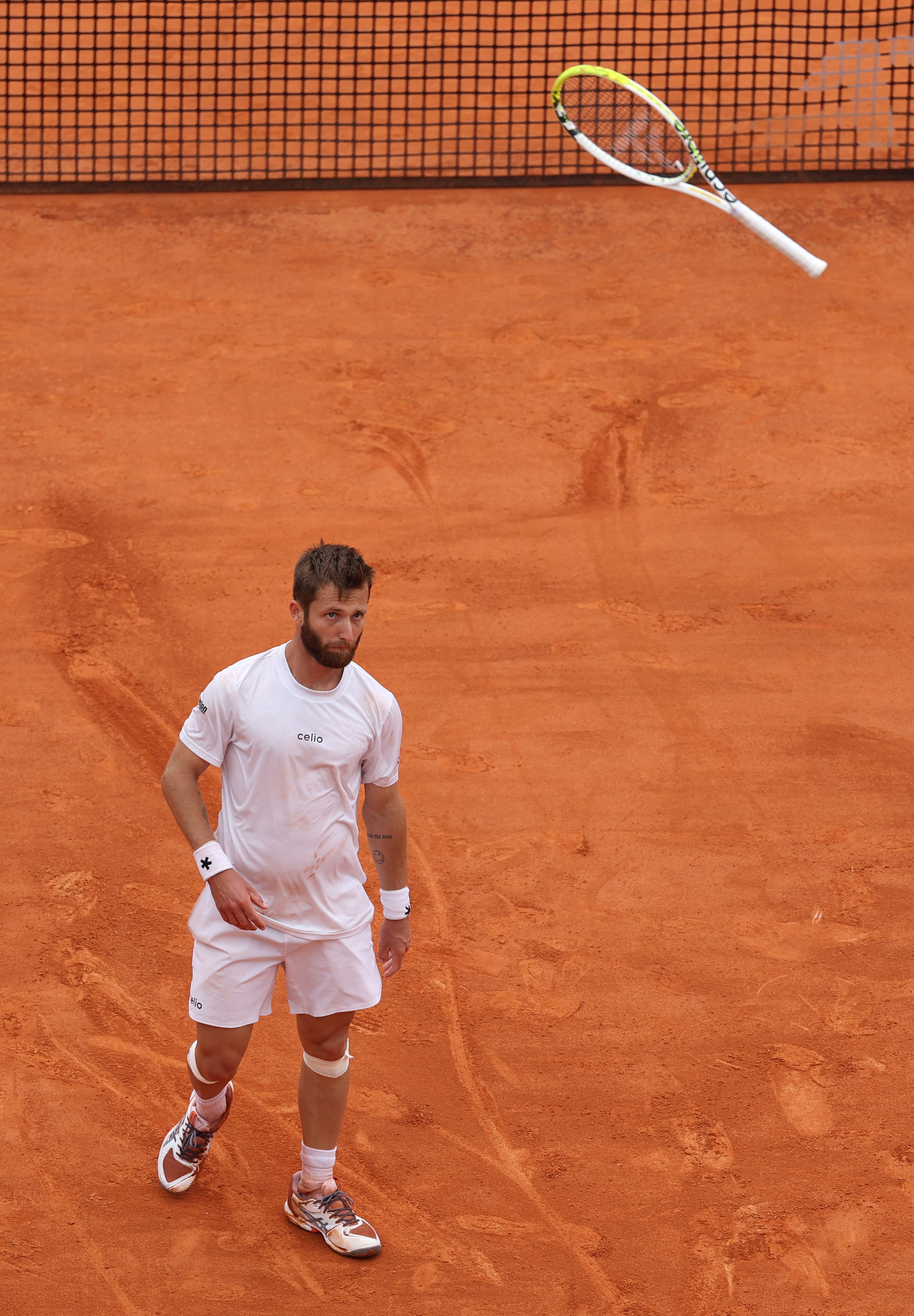 Corentin Moutet of France throws his racket against David Goffin of Belgium during the Qualifying Final round during day one of the Rolex Monte-Carlo Masters at Monte-Carlo Country Club on April 06, 2025 in Monte-Carlo, Monaco. (Photo by Clive Brunskill/Getty Images)