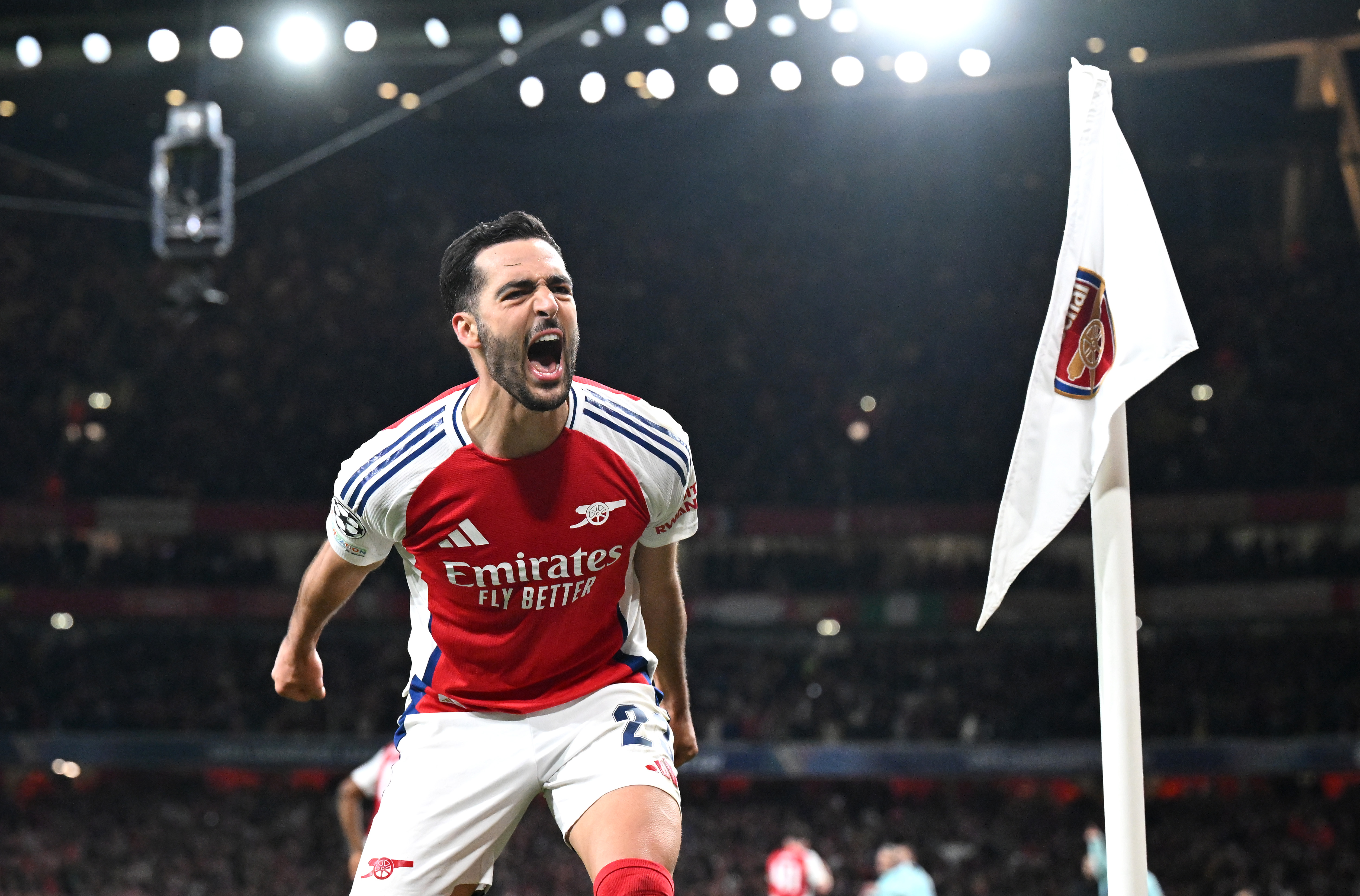 Mikel Merino of Arsenal celebrates scoring his team's third goal during the UEFA Champions League 2024/25 Quarter Final First Leg match between Arsenal FC and Real Madrid C.F. at Emirates Stadium on April 08, 2025 in London, England. (Photo by Stuart MacFarlane/Arsenal FC via Getty Images)