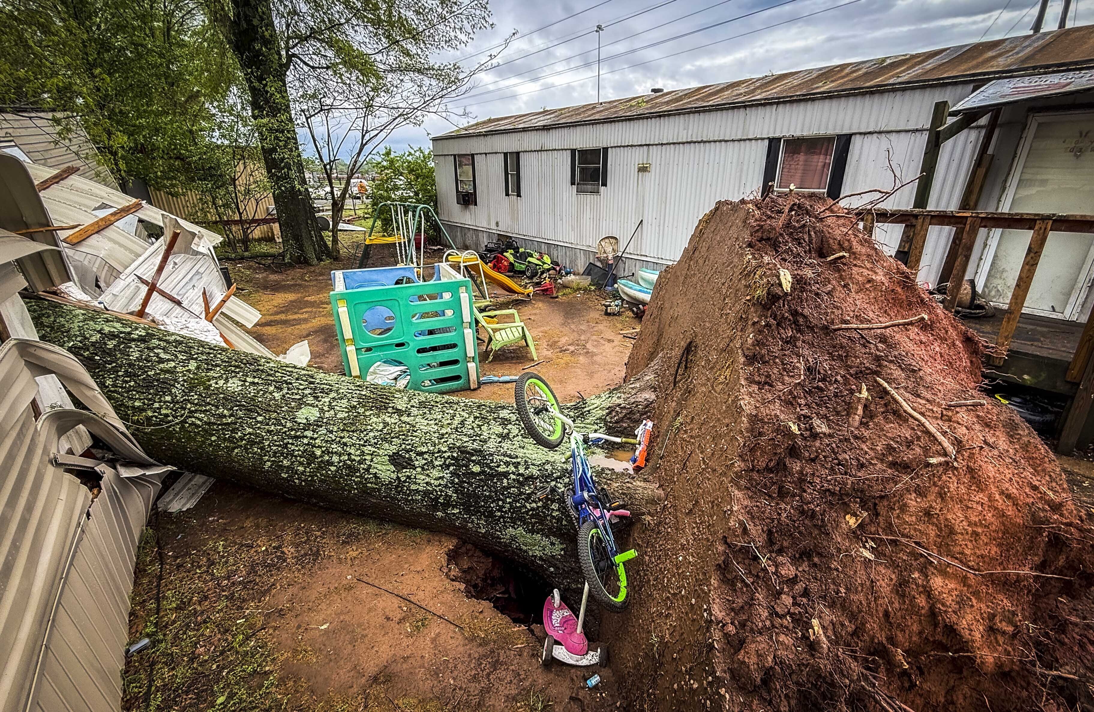 An uprooted tree is seen amidst damage at Pounders Mobile Home Park following strong storms in the area in Muscle Shoals, Ala., Sunday, April 6, 2025. (Photo by Dan Busey/The TimesDaily via AP Photo)