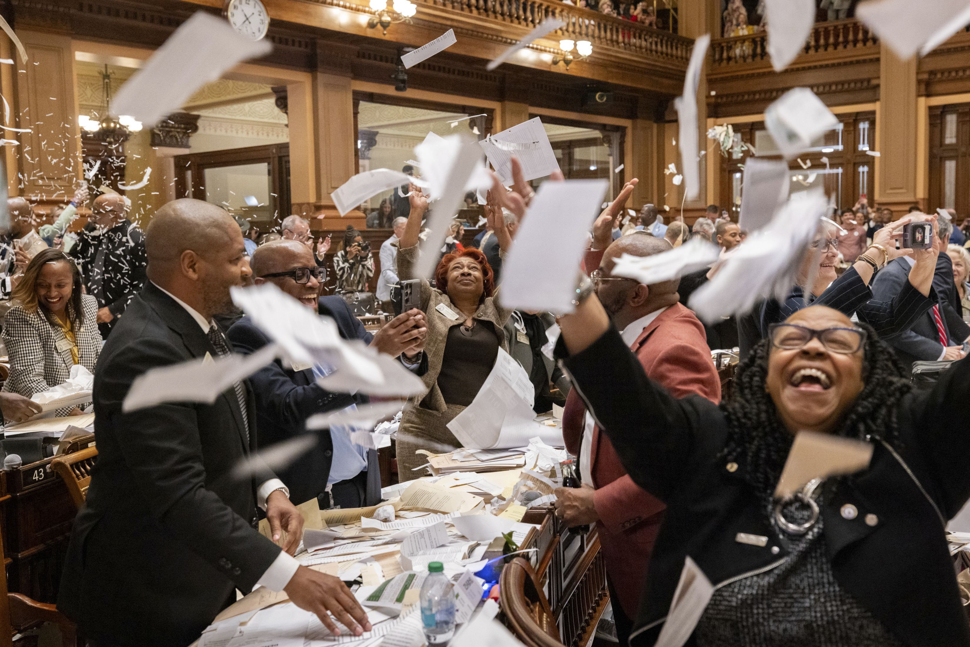 State representatives toss papers in the air at the House of Representatives at the Capitol in Atlanta on Sine Die, Friday, April 4, 2025, the final day of the legislative session. (Photo by Arvin Temkar/Atlanta Journal-Constitution via AP Photo)