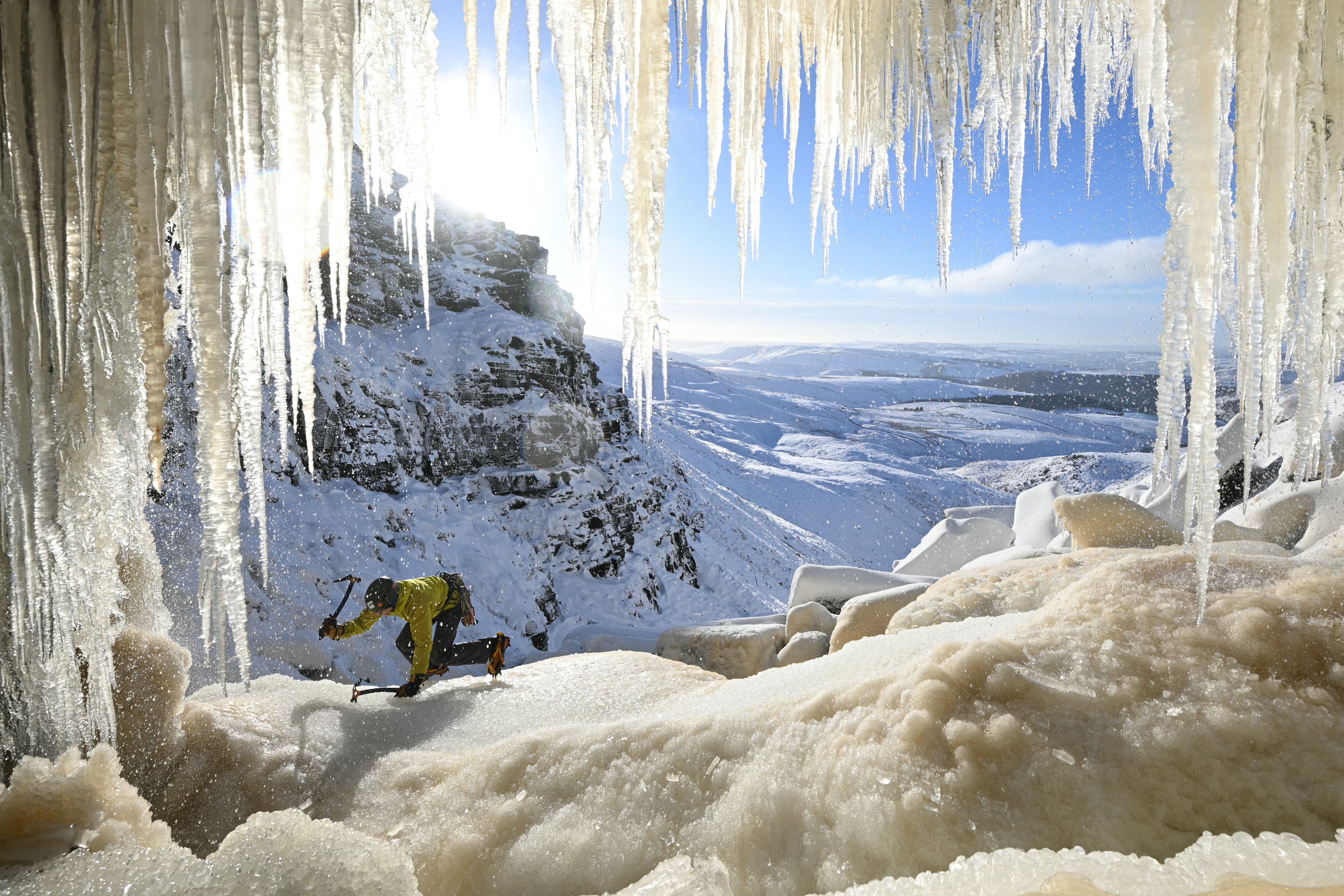 An ice climber ascends Kinder Downfall, a frozen waterfall in the Peak District National Park, near Hayfield, in north-west England as temperatures in the region plummet on January 10, 2025. Temperatures continue to fall over the coming days, possibly reaching minus 20C in northern parts of the UK on Friday night, the Met Office has forecast. (Photo by Oli Scarff/AFP Photo)