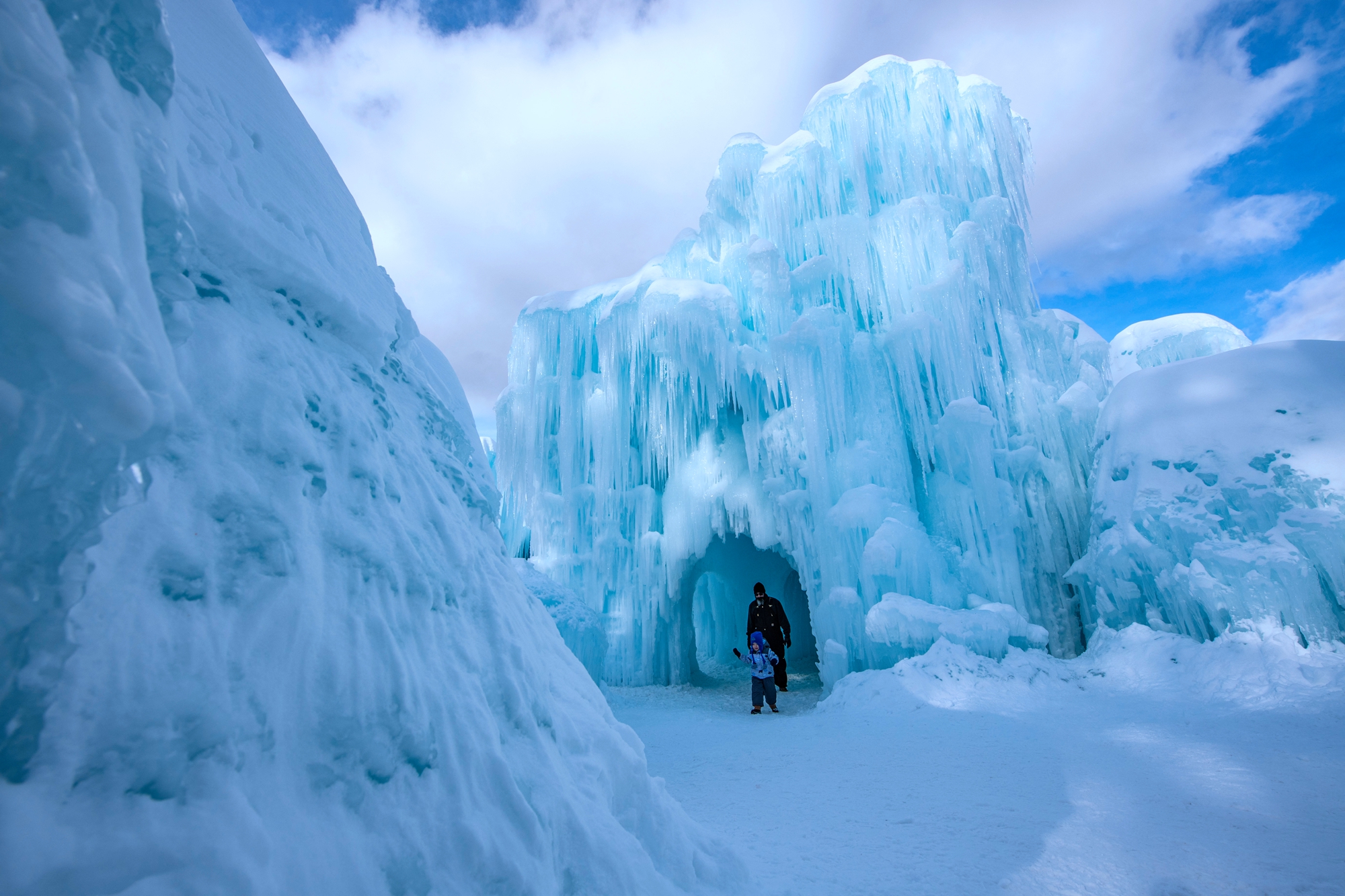 People trek through the caverns and snow at Ice Castles in North Woodstock, New Hampshire on February 8, 2025. Founder Brent Christensen, crafted his first icy creation in the front yard of his home to bring happiness and joy to his children. Since 2011, Ice Castles has been dedicated to creating a world of ice caves, frozen waterfalls, and glaciers formed into archways, caverns, slides, and tunnels. (Photo by Joseph Prezioso/AFP Photo)