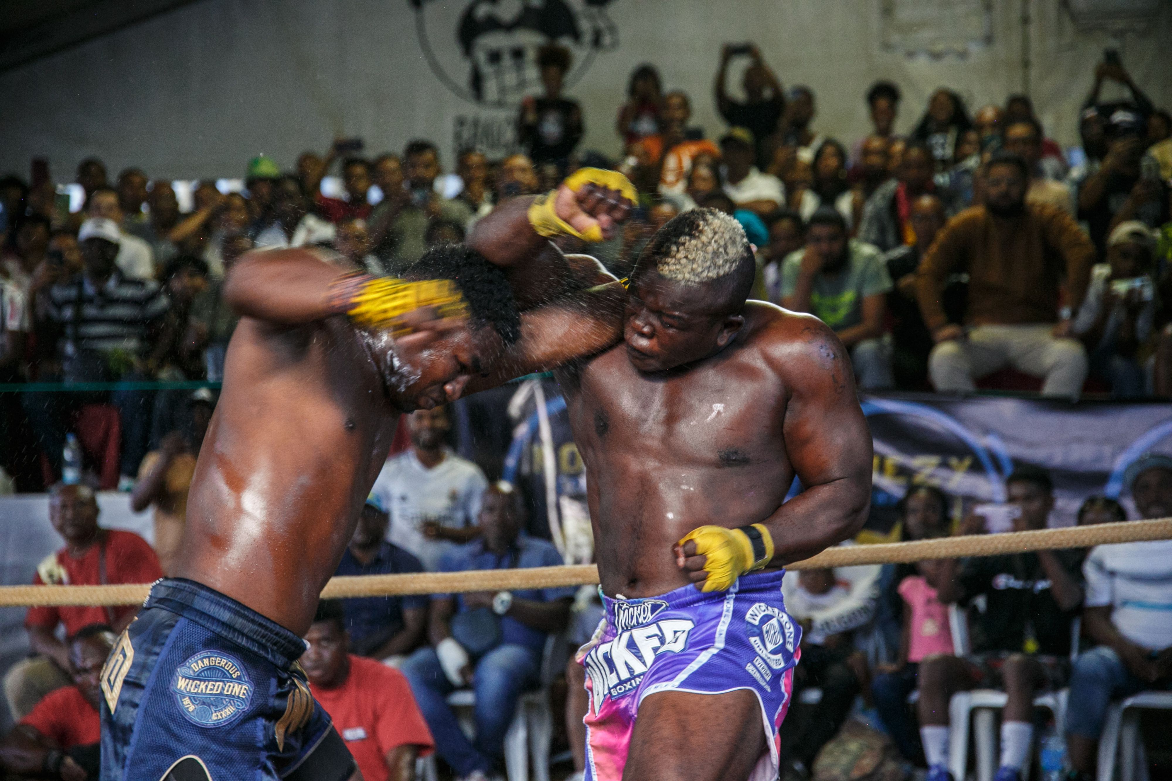 Fighters compete during the “Morengy Iarivo” sporting event, a morengy competition organized for the first time in Antananarivo, on April 6, 2025. Barefoot in the dust, their hands wrapped in thin fabric, a handful of athletes practised moraingy, a traditional Madagascan martial art, ahead of a fight in Antananarivo stadium.